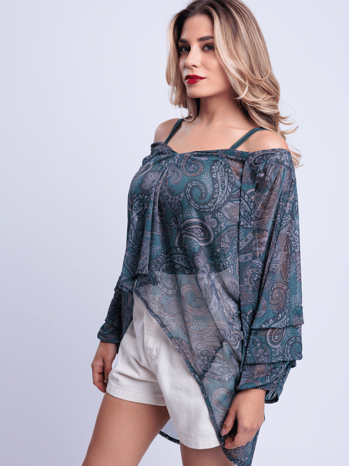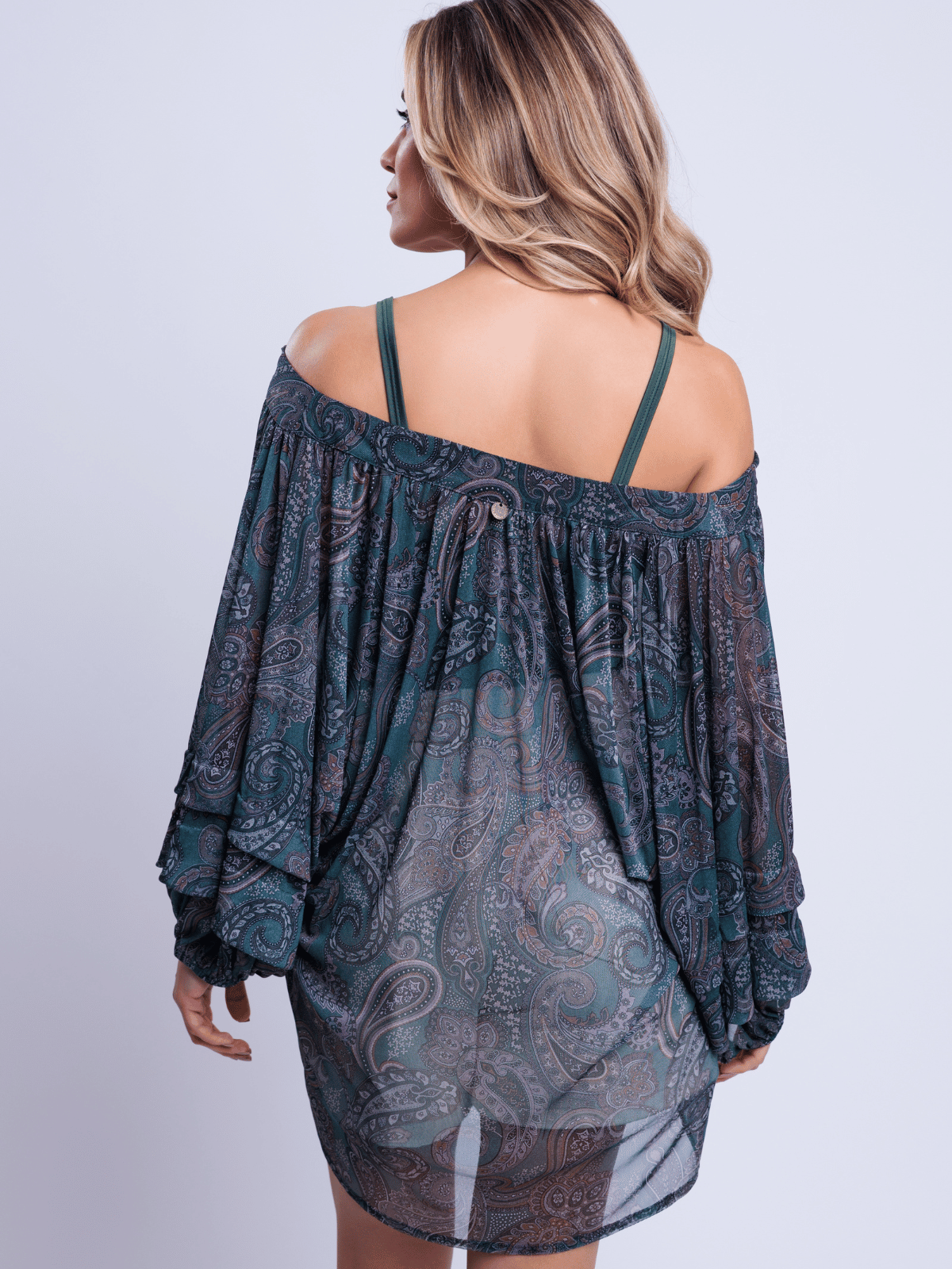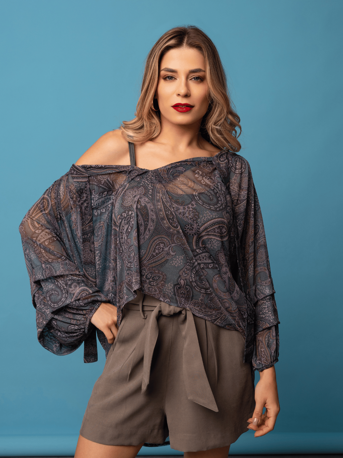 A Bata Elodie traduz a estética boho com leveza, fluidez e um design inteligente. Confeccionada em tule estampado paisley, a peça traz movimento delicado e uma presença visual marcante, perfeita para composições femininas e descomplicadas.
