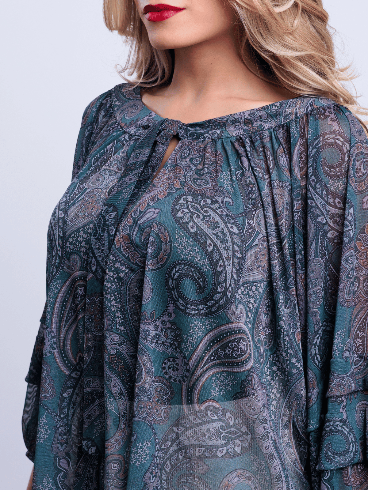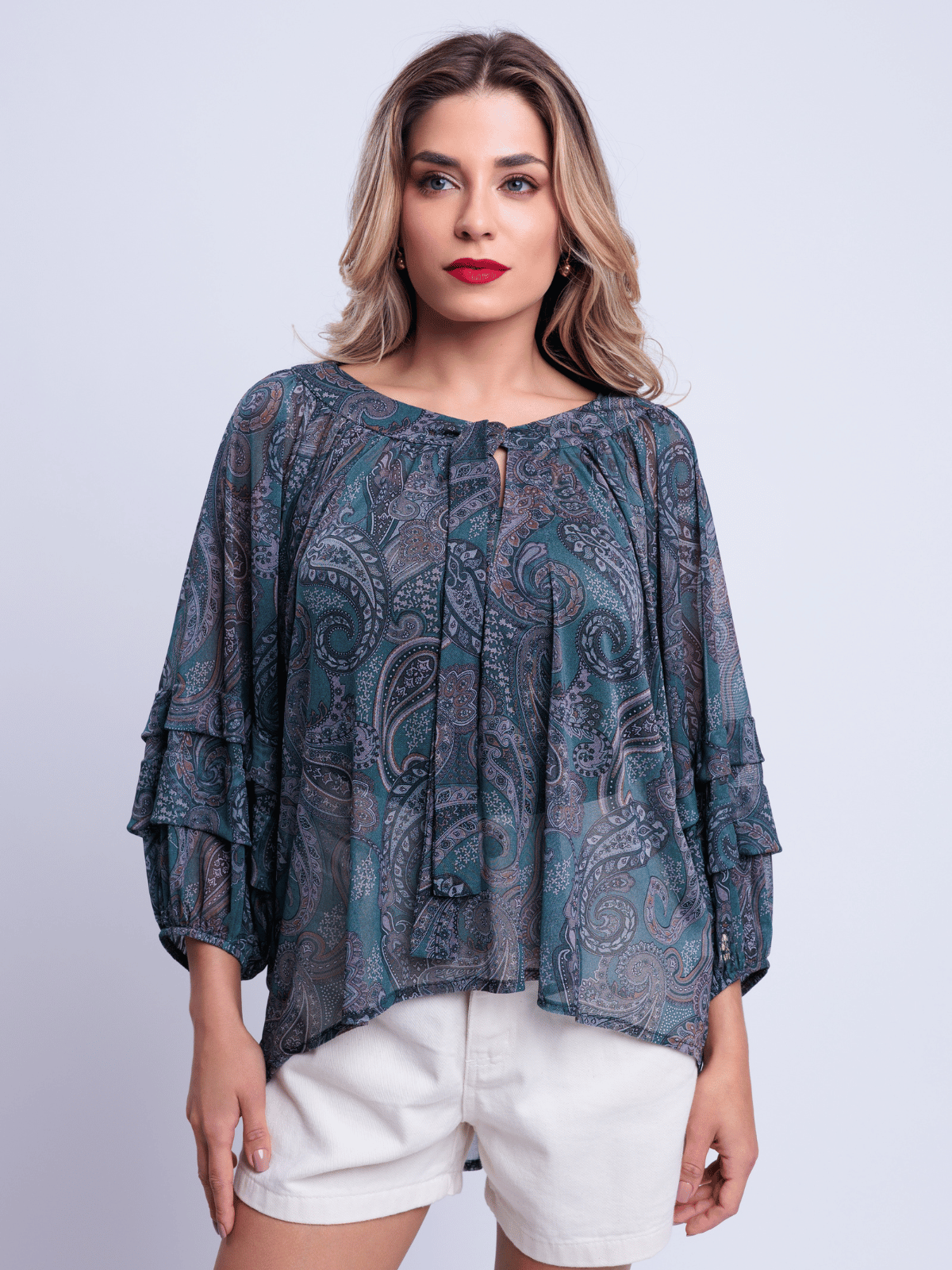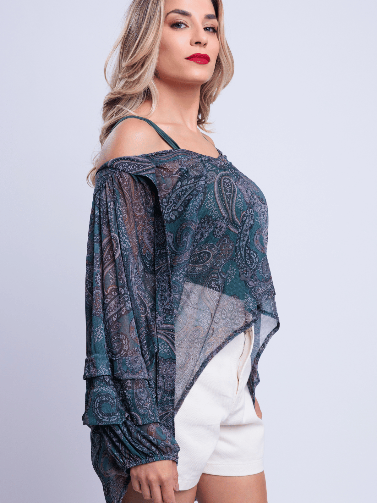 A Bata Elodie traduz a estética boho com leveza, fluidez e um design inteligente. Confeccionada em tule estampado paisley, a peça traz movimento delicado e uma presença visual marcante, perfeita para composições femininas e descomplicadas.