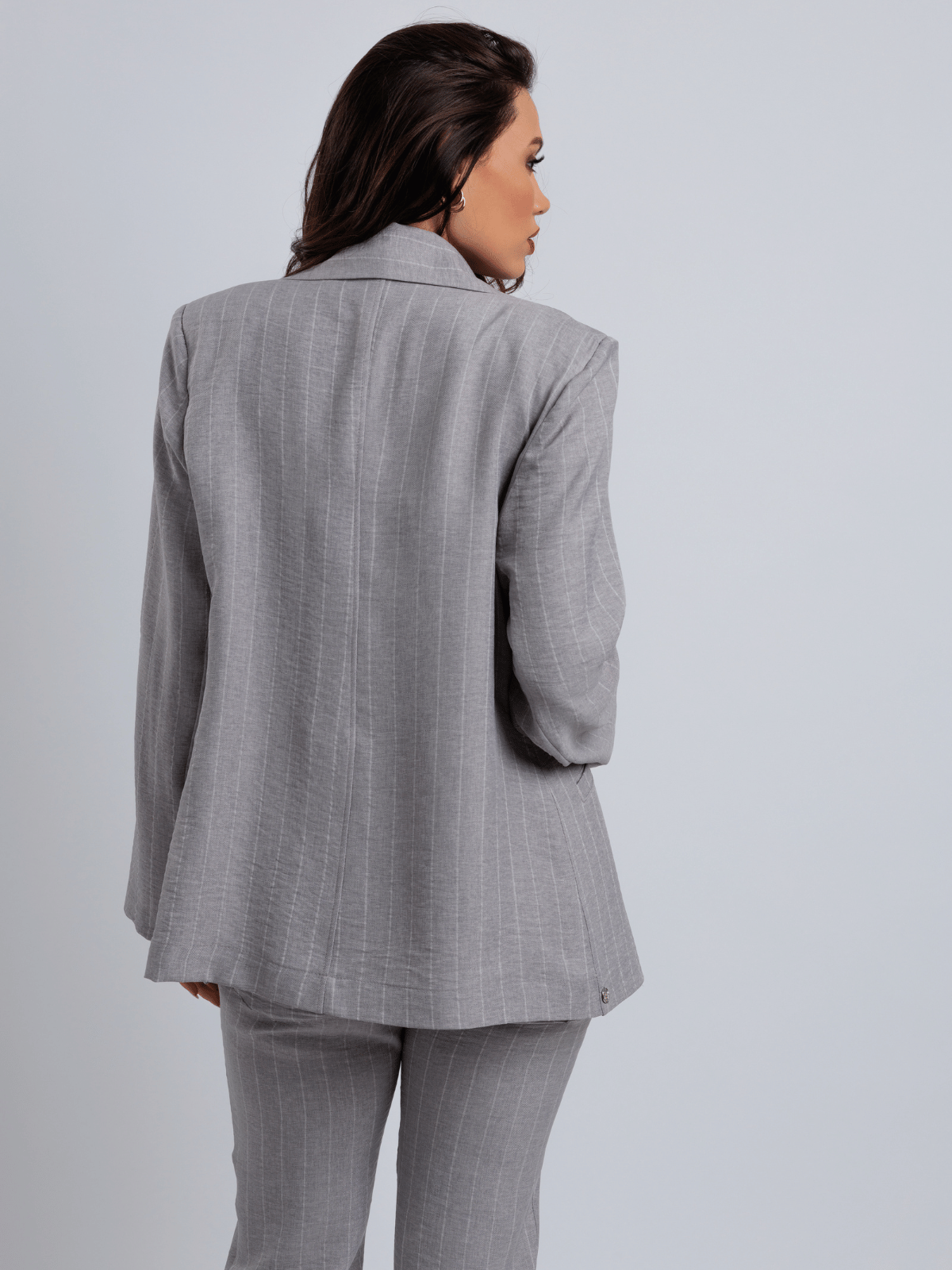 Com modelagem de alfaiataria, shape reto e comprimento levemente alongado, o modelo apresenta gola dupla, abertura frontal com botão único, ombros estruturados com ombreiras forradas e bolsos funcionais na parte frontal, garantindo caimento impecável e acabamento refinado.