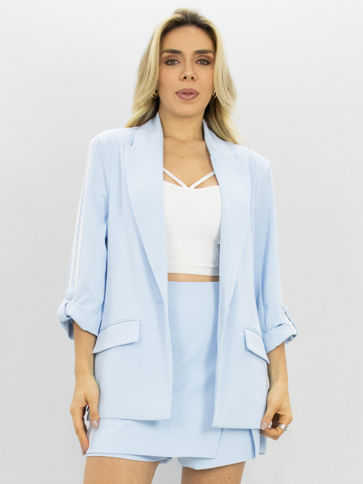 A Alfaiataria é um item curinga no nosso armário para criar uma produção mais sofisticada. Nosso Blazer Lorran foi confeccionado em um tecido plano, possui uma estrutura e tem toque macio, sua modelagem de alfaiataria tem um caimento mais reto, suas mangas são 7/8 com martingale, seu fechamento é frontal através de um botão, possui bolso frontal e conta com um detalhe de listra em sua lateral e nas mangas. Uma peça que transita em vários estilos e ocasião.