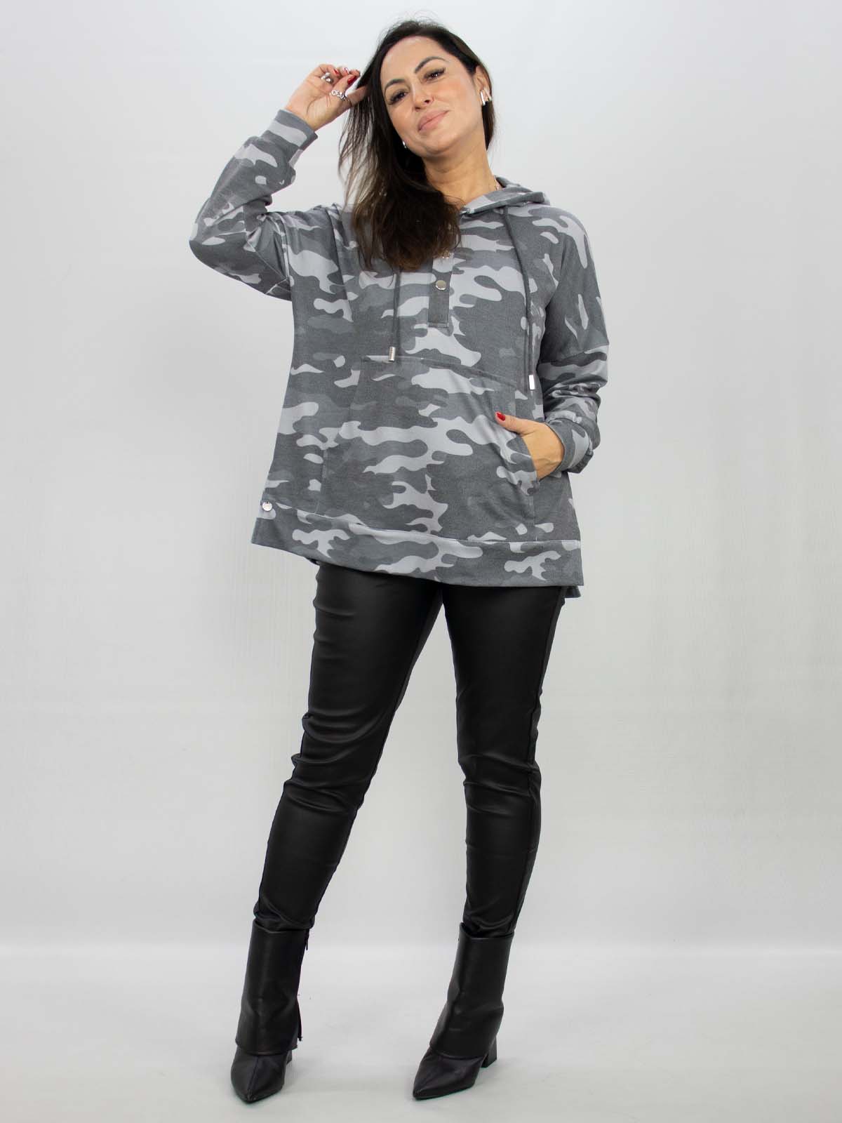 A Blusa Fabíola é aquela peça essencial para o seu armário. Com uma modelagem mais ampla e alongada, é quase um oversized, ele possui mangas longas, decote em V, capuz com ajuste de um cordão, bolso canguru. Uma Blusa clássica que tem a facilidade de transitar em variados estilos.