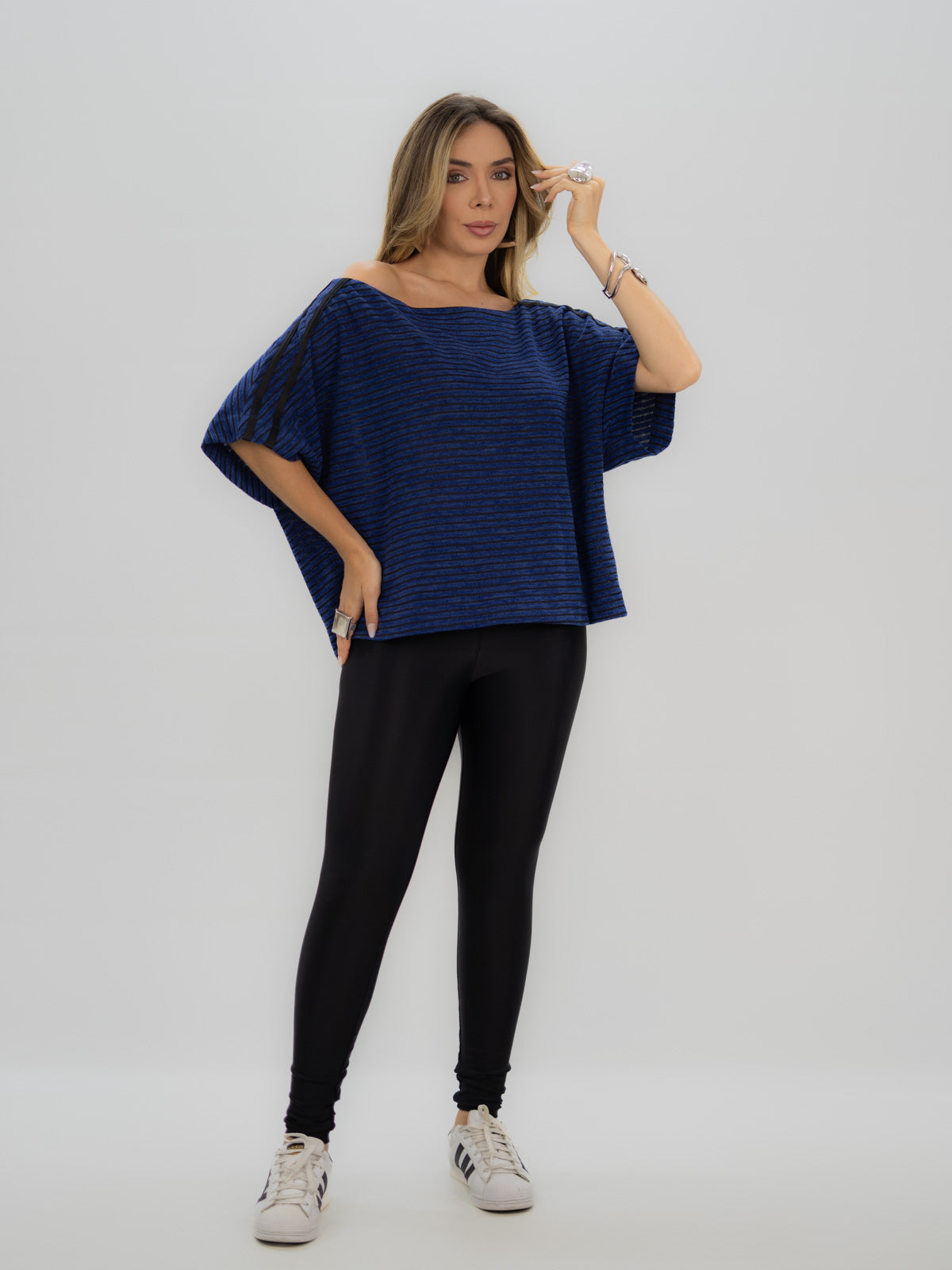 A Blusa Fiora tem uma modelagem com comprimento médio curto, um caimento mais soltinho trazendo leveza e conforto ao vest-la, com manga curta, seu tecido tem uma leve estrutura e, a peça conta com 2 detalhes, um que é a faixa nas mangas adicionando um toque de estilo e o outro é um recorte triângulo nas costas onde o sentindo da listra fica na vertical, elevando o visual de uma forma sutil.