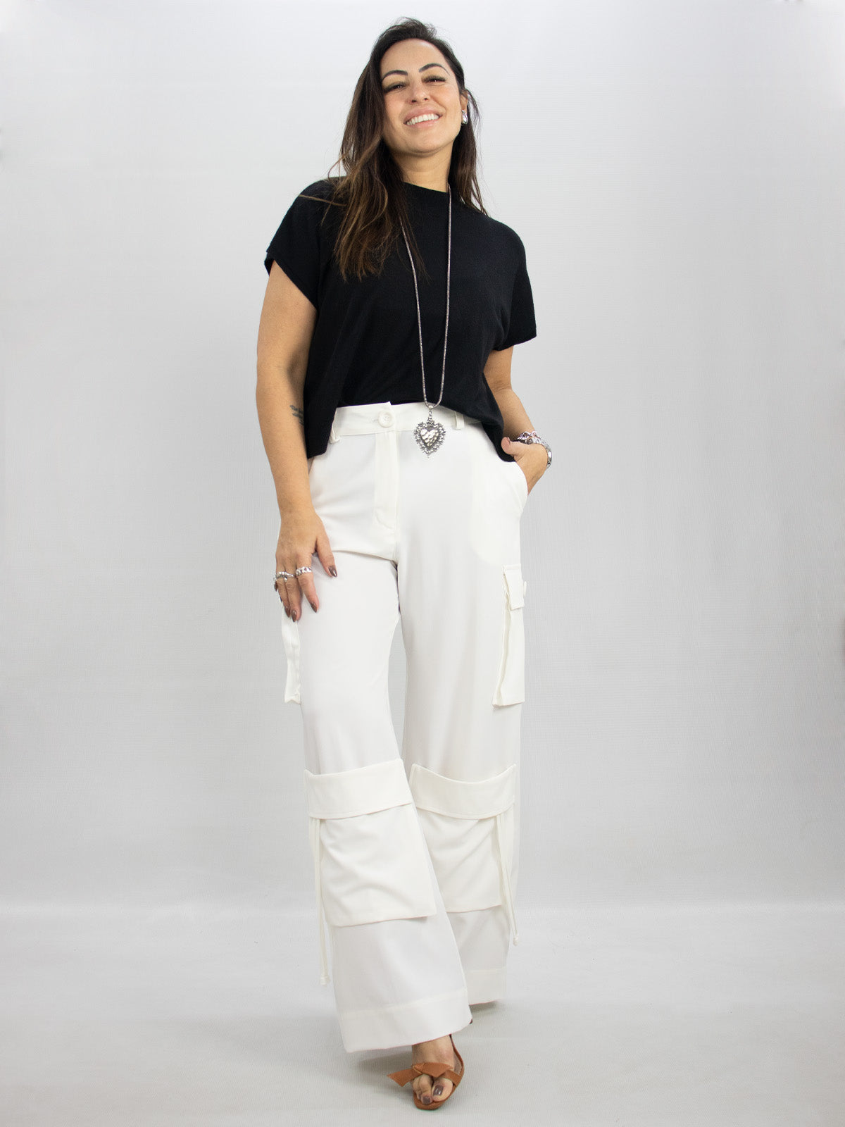 A calça Alanny possui uma modelagem de alfaiataria com um corte mais amplo e fluido, de cintura média, cós com passante e elástico na parte de trás, bolso cargo com lapela por sua extensão lateral, além dos bolsos frontais laterais e posteriores. Seu fechamento é frontal através de zíper e abotoamento. É uma peça estilosa e versátil que vai desde ocasiões casuais até as formais.