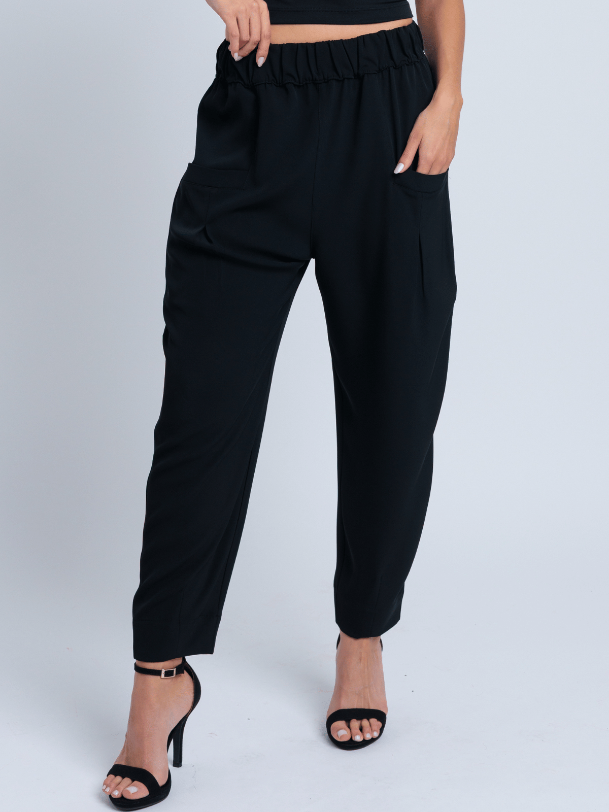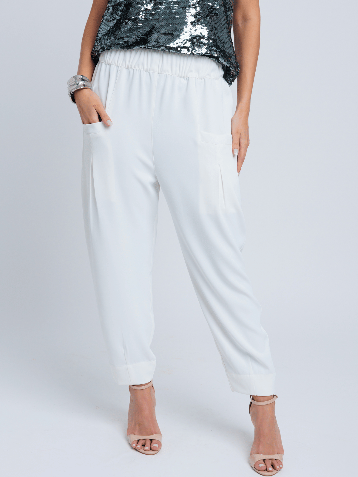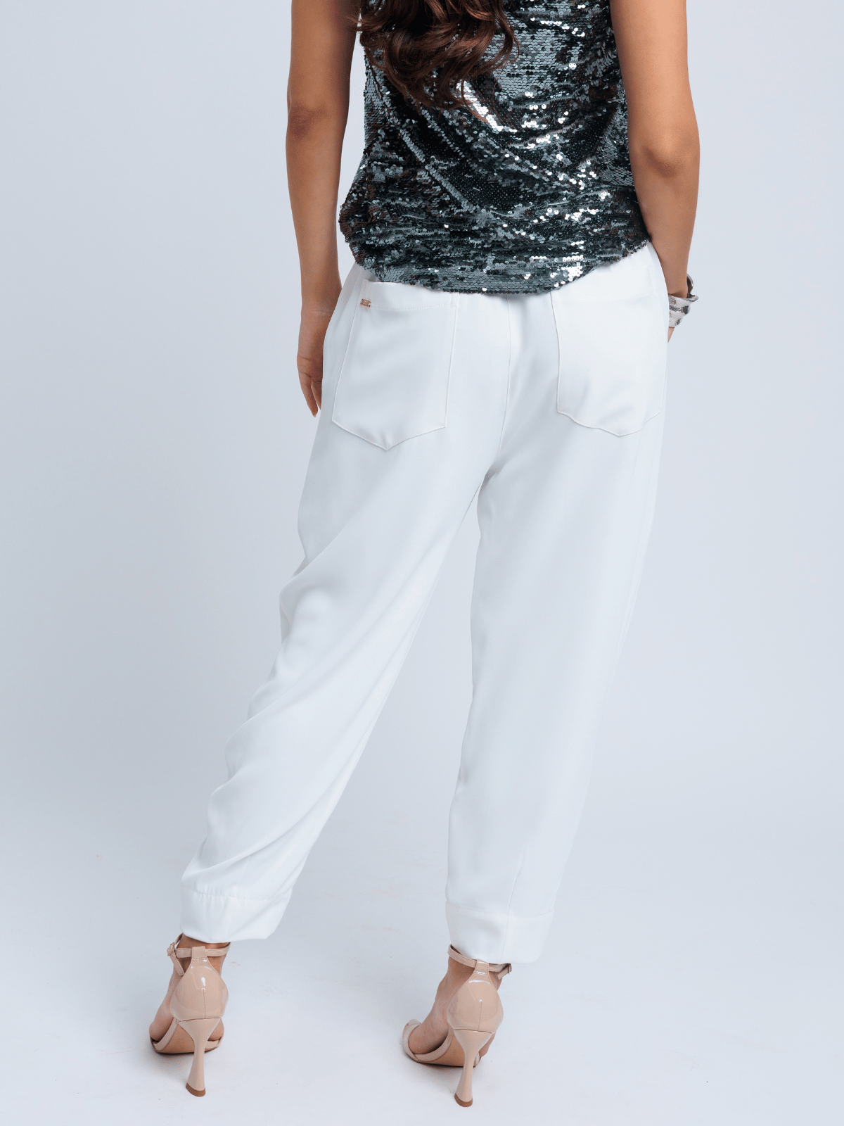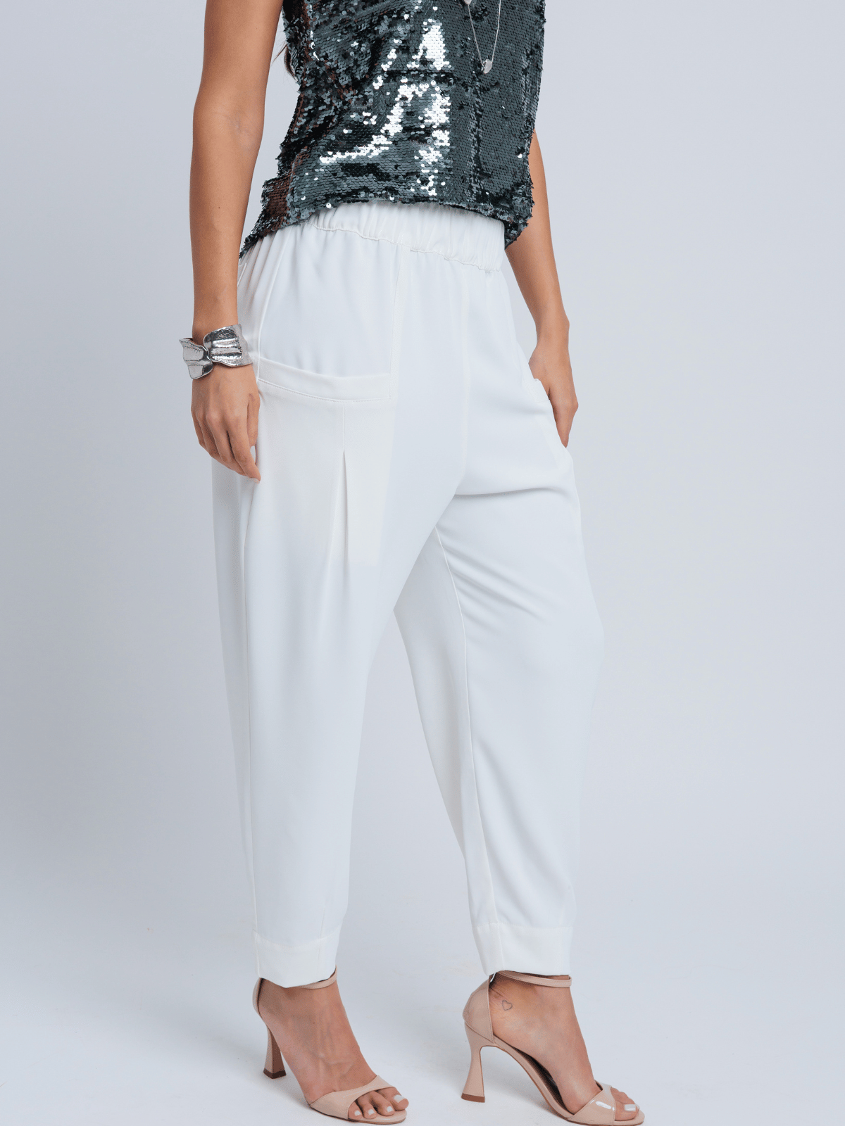 Aqui, a proposta foi descontruir a formalidade da alfaiataria para criar uma versão moderna e despojada: cintura com elástico, bolso mais baixo e um shape confortável que acompanha o corpo sem marcar.