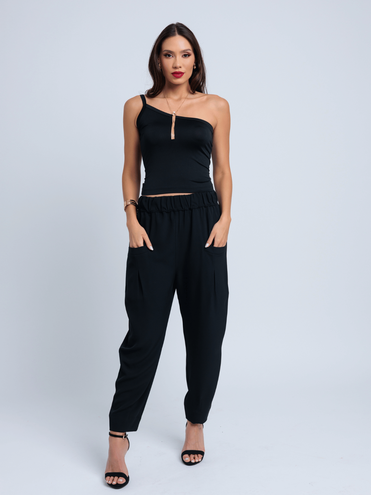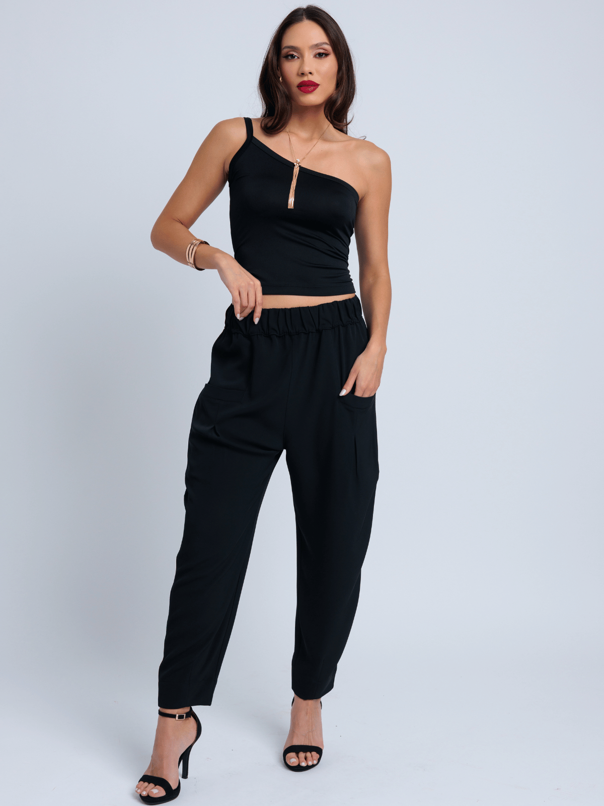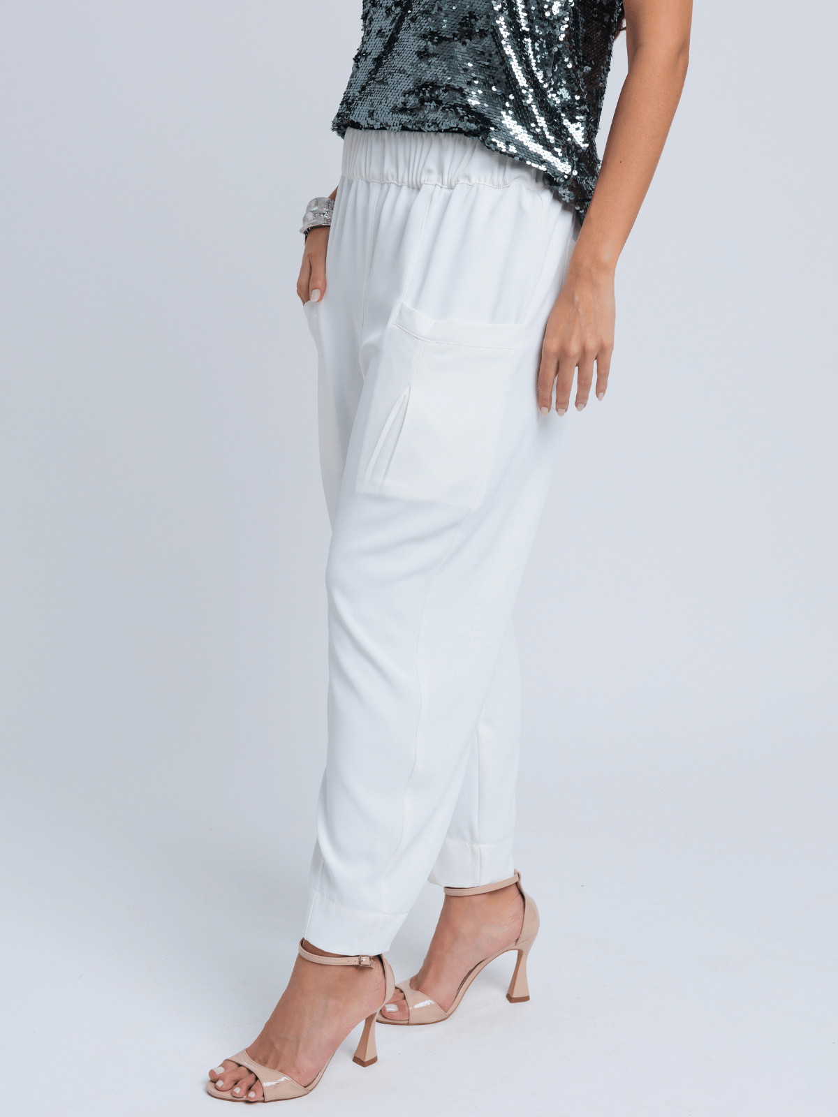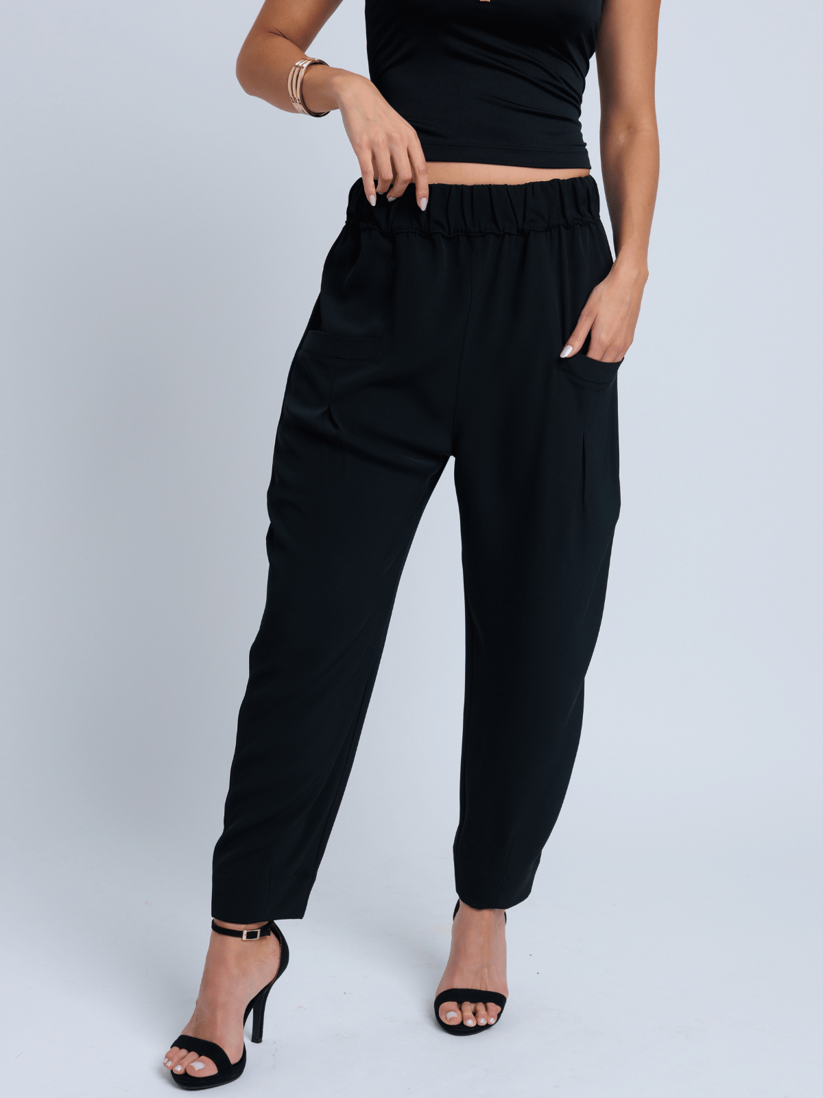 Aqui, a proposta foi descontruir a formalidade da alfaiataria para criar uma versão moderna e despojada: cintura com elástico, bolso mais baixo e um shape confortável que acompanha o corpo sem marcar.