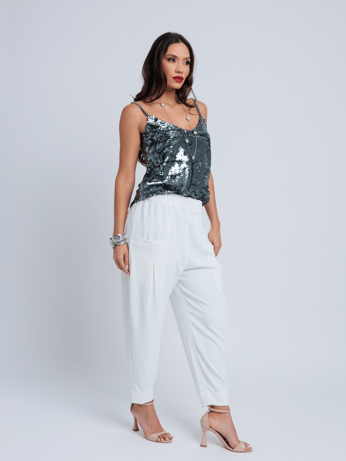 É uma calça extremamente versátil — da produção básica ao look arrumado — entregando frescor e elegância em qualquer ocasião.