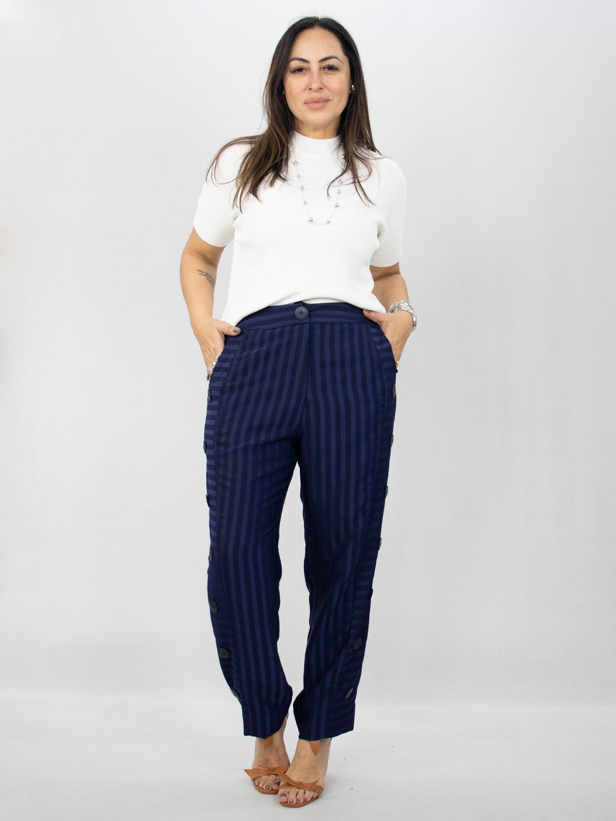 Ideal para compor looks elegantes e modernos, a calça Bianchi pode ser combinada com camisas em tecidos leves, regatas de alça fina ou até mesmo blazers para uma proposta mais refinada. Aposte em sapatos de salto, mocassins ou tênis para diferentes ocasiões — do trabalho ao happy hour.