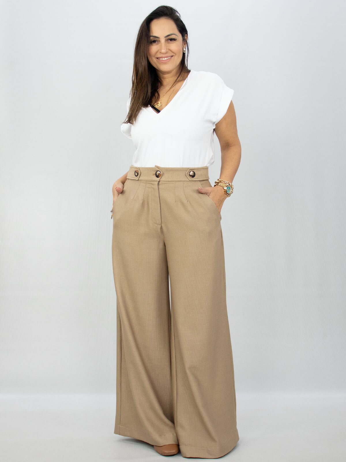 A Calça Elenara apresenta uma modelagem ampla como pantalona, cós médio, bolsos posteriores com lapela trazendo uma alfaiataria desconstruída e moderna, fechamento frontal por zíper e abotoamento. Uma peça ideal para compor produções elegantes quanto casuais.