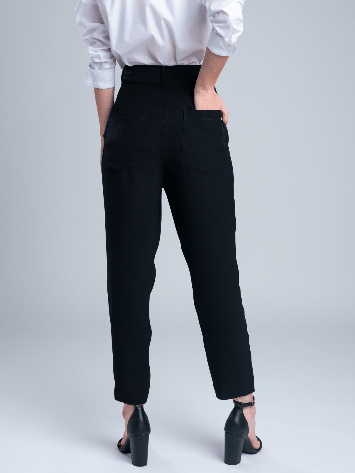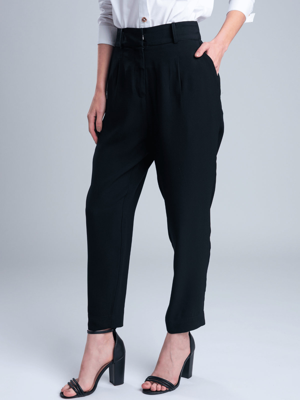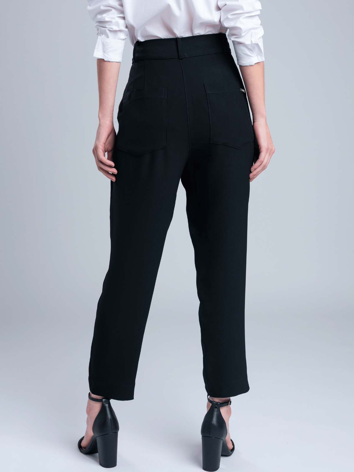 Confeccionada em alfaiataria de crepe Onassis, apresenta cós com passantes para cinto e fechamento frontal com zíper e colchete de calça social, garantindo um acabamento refinado e ajuste confortável ao corpo.