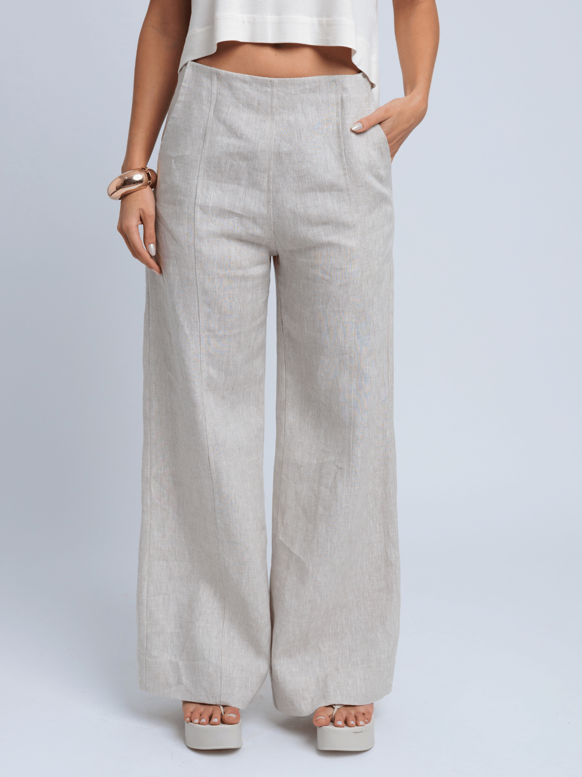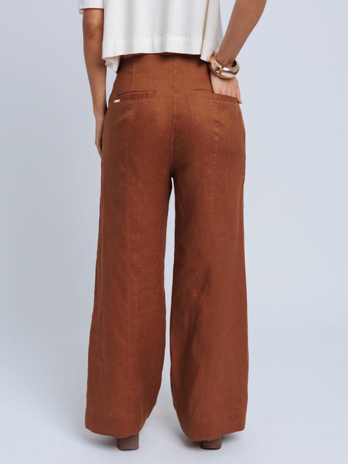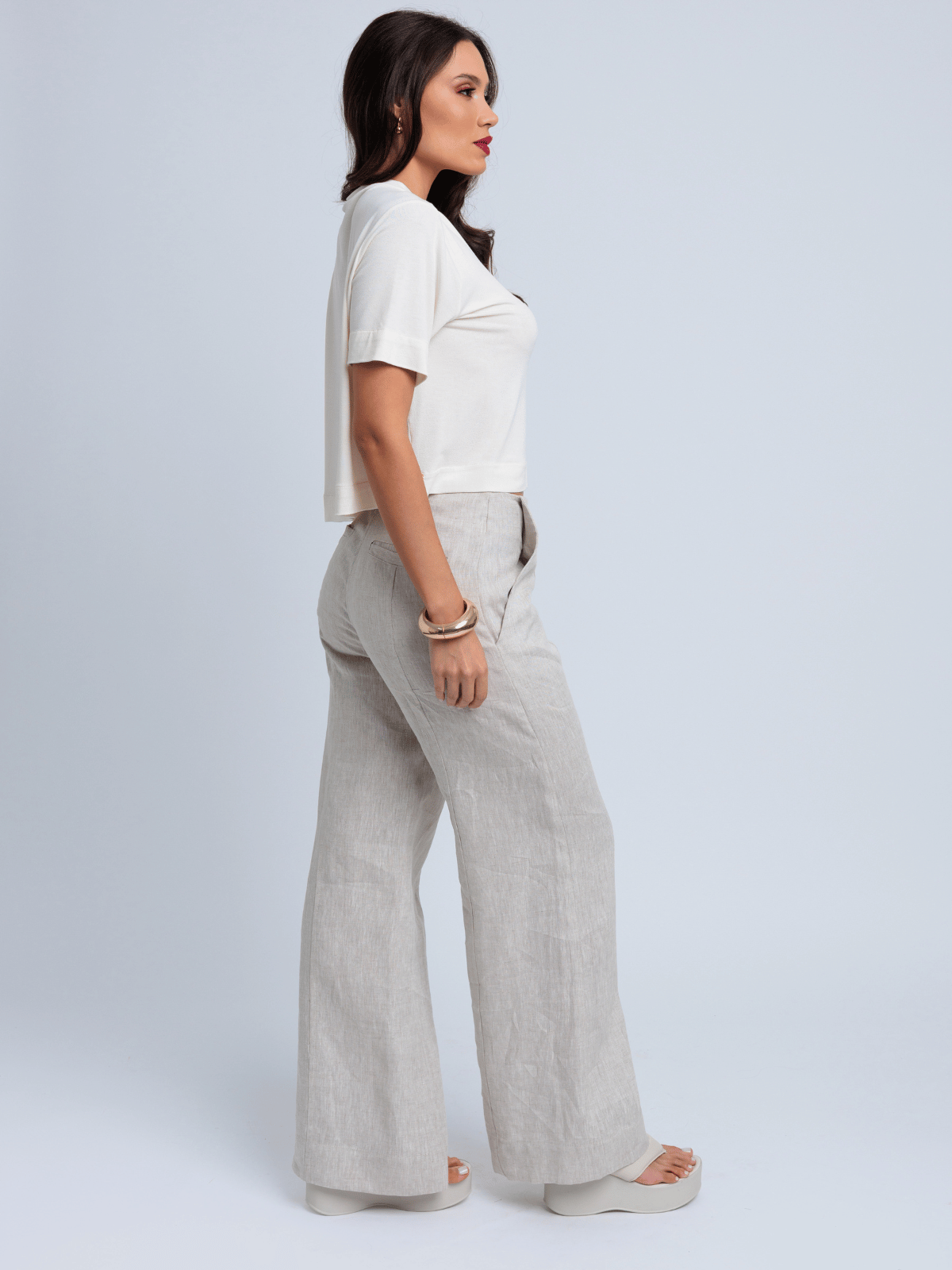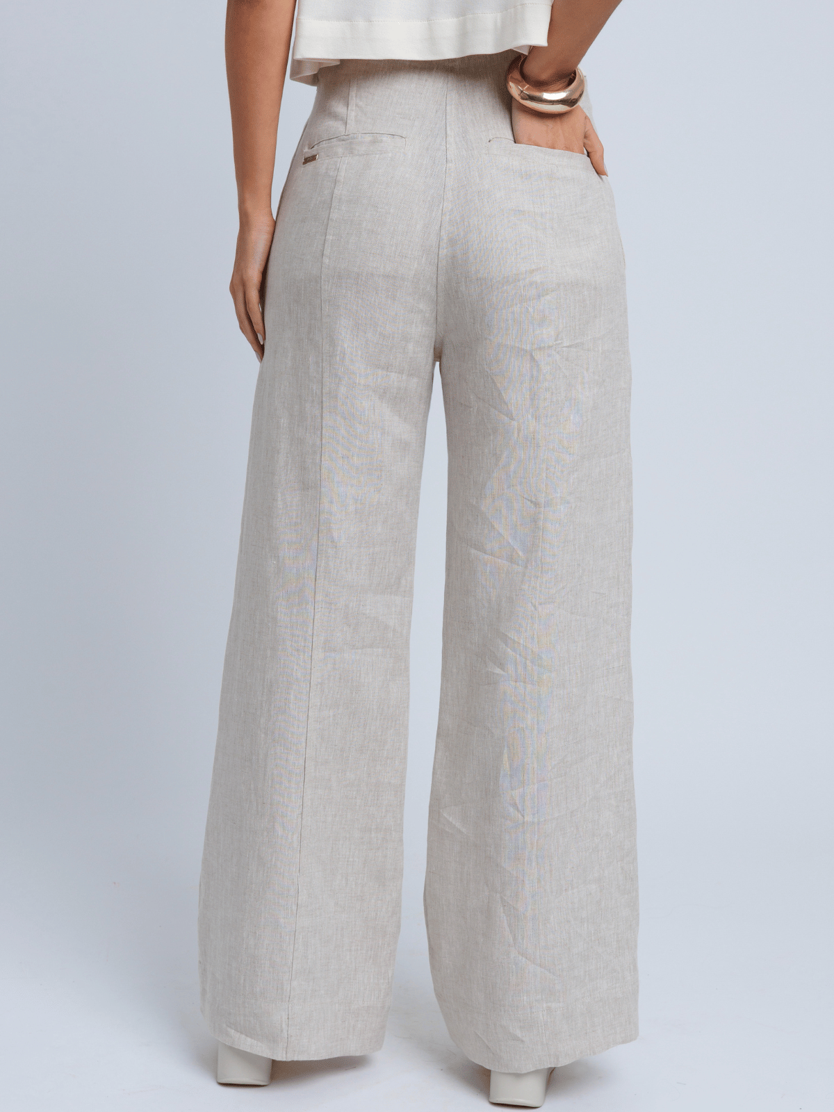 A Calça Lorenza é confeccionada em linho 100% de alta qualidade, entregando um caimento impecável e um shape wide leg elegante, que alonga a silhueta sem pesar.