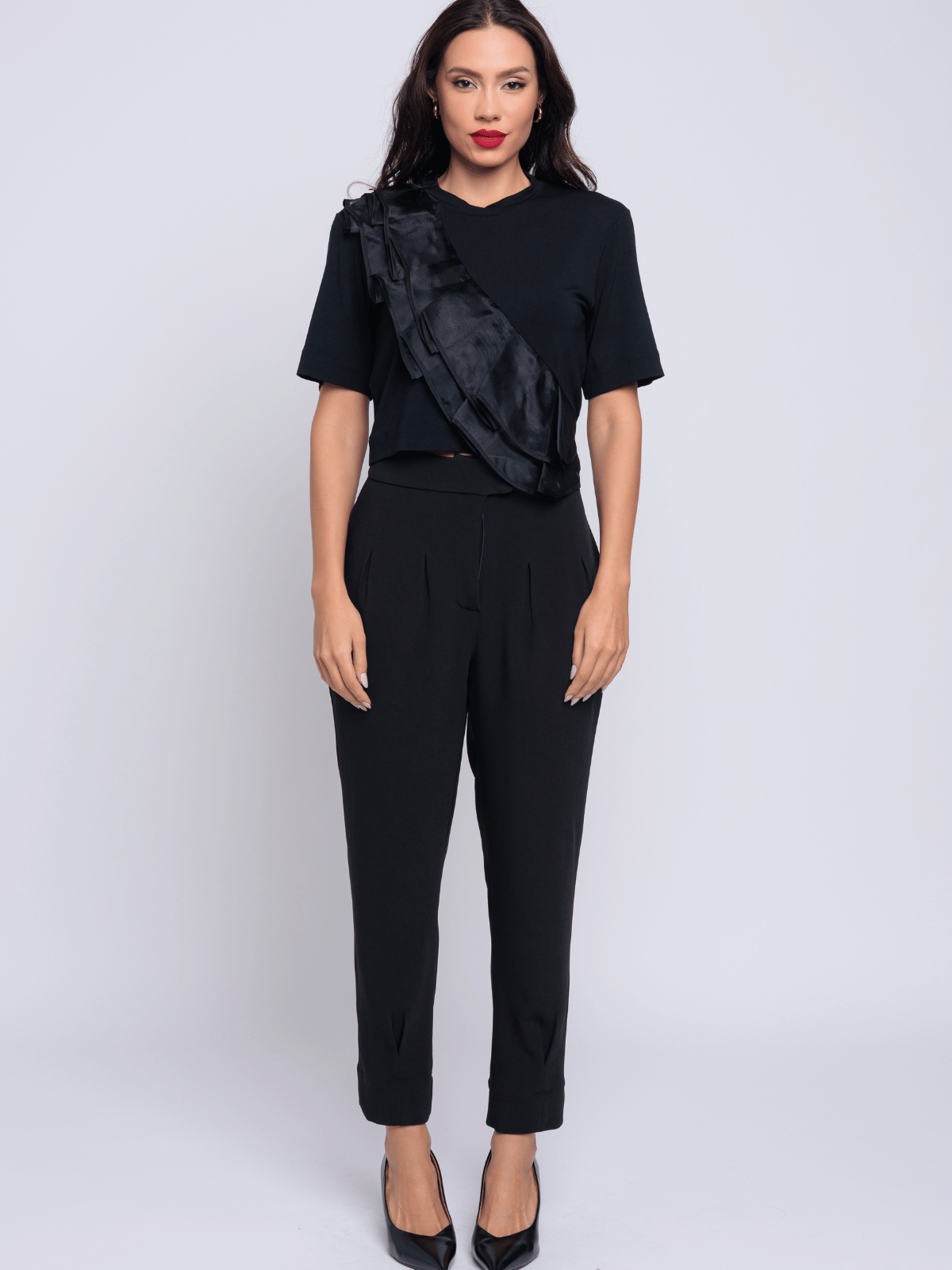 Versátil, transita com facilidade entre produções formais e casuais. Com salto, alonga a silhueta e cria uma proposta elegante; com tênis, traz um ar moderno e despojado. Uma peça curinga para compor looks atuais, confortáveis e funcionais.