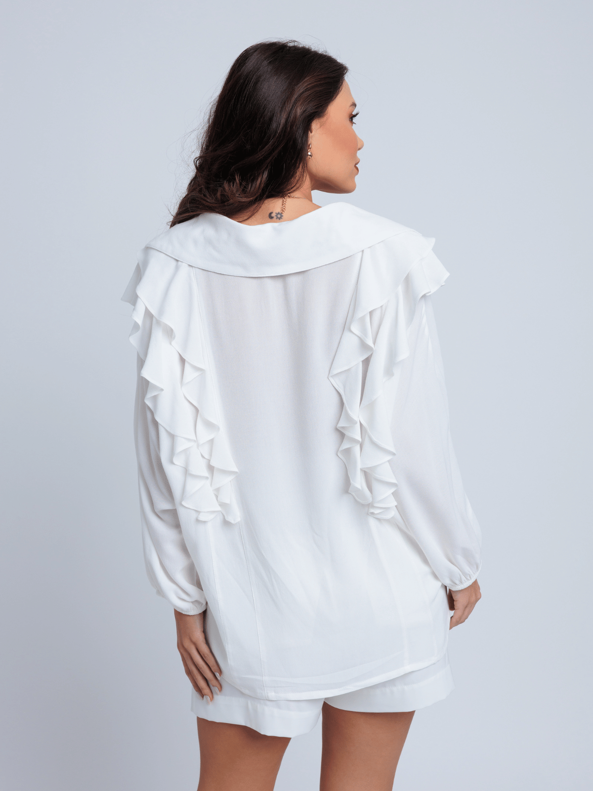 Com babados delicados e mangas 3/4, é confeccionada em um tecido leve e fresco, proporcionando conforto sem perder presença.