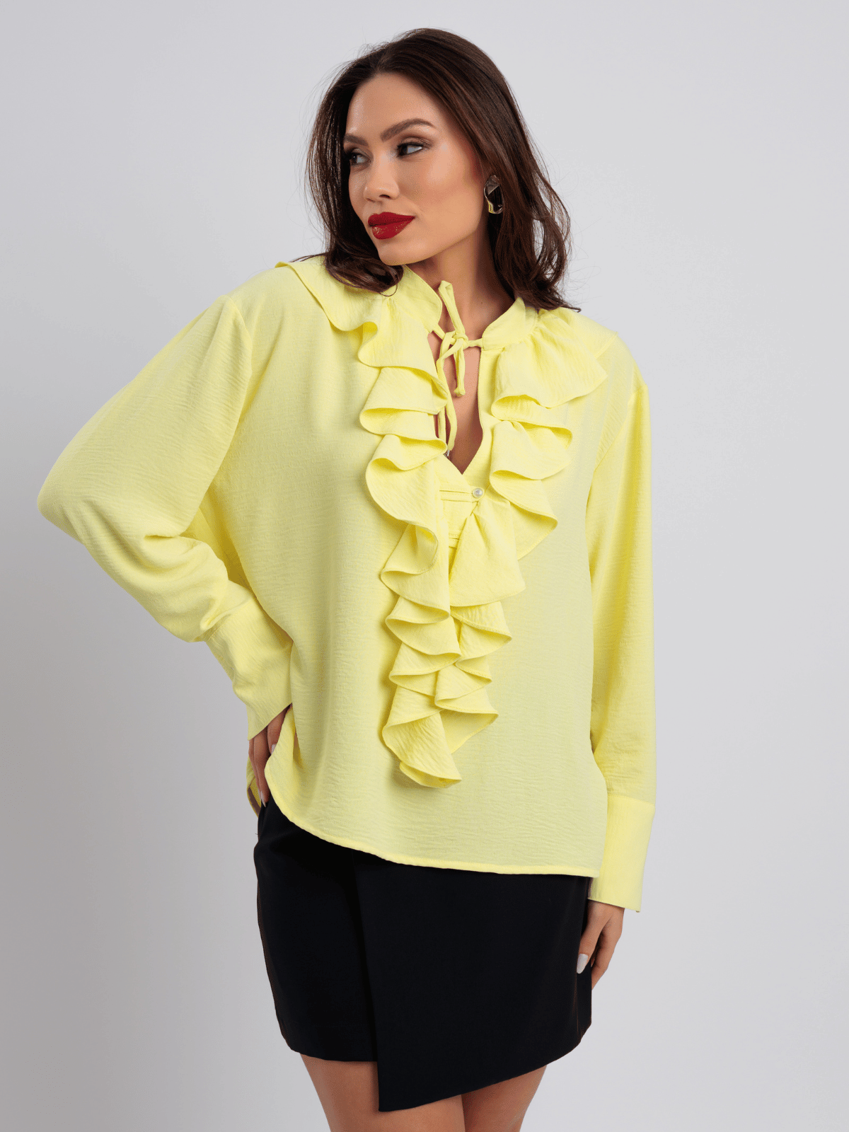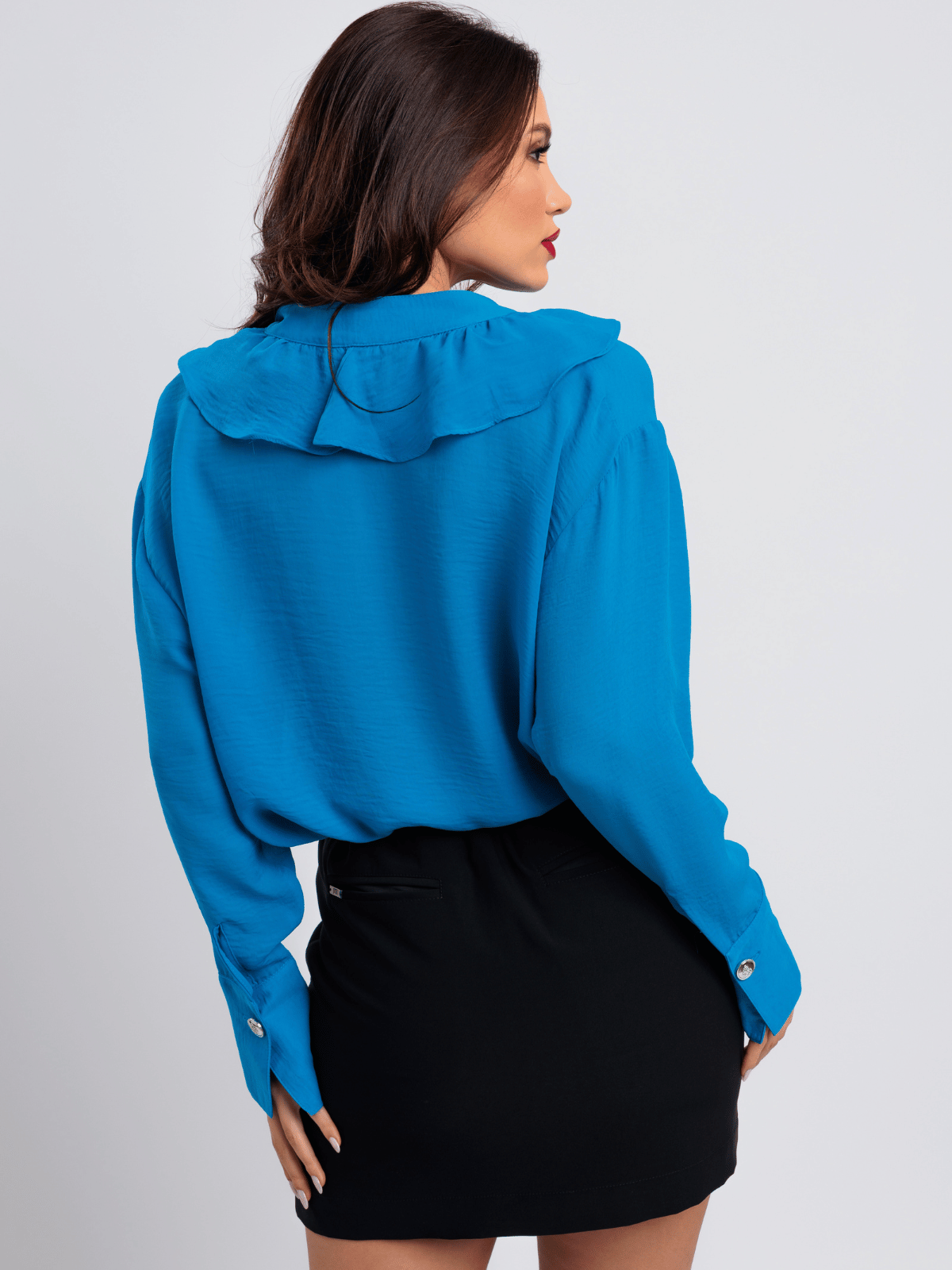 Confeccionada em crepe toque de seda, apresenta caimento leve e textura agradável, proporcionando elegância com conforto. O destaque fica por conta dos babados frontais, que adicionam um toque romântico e fashionista à produção, além dos botões de coração nos punhos e botões pérola na vista frontal, conferindo charme e delicadeza ao design.