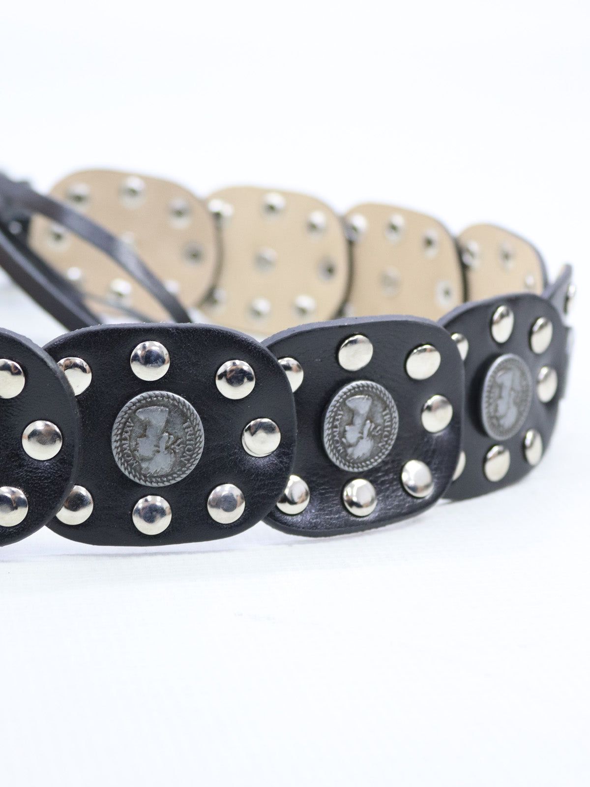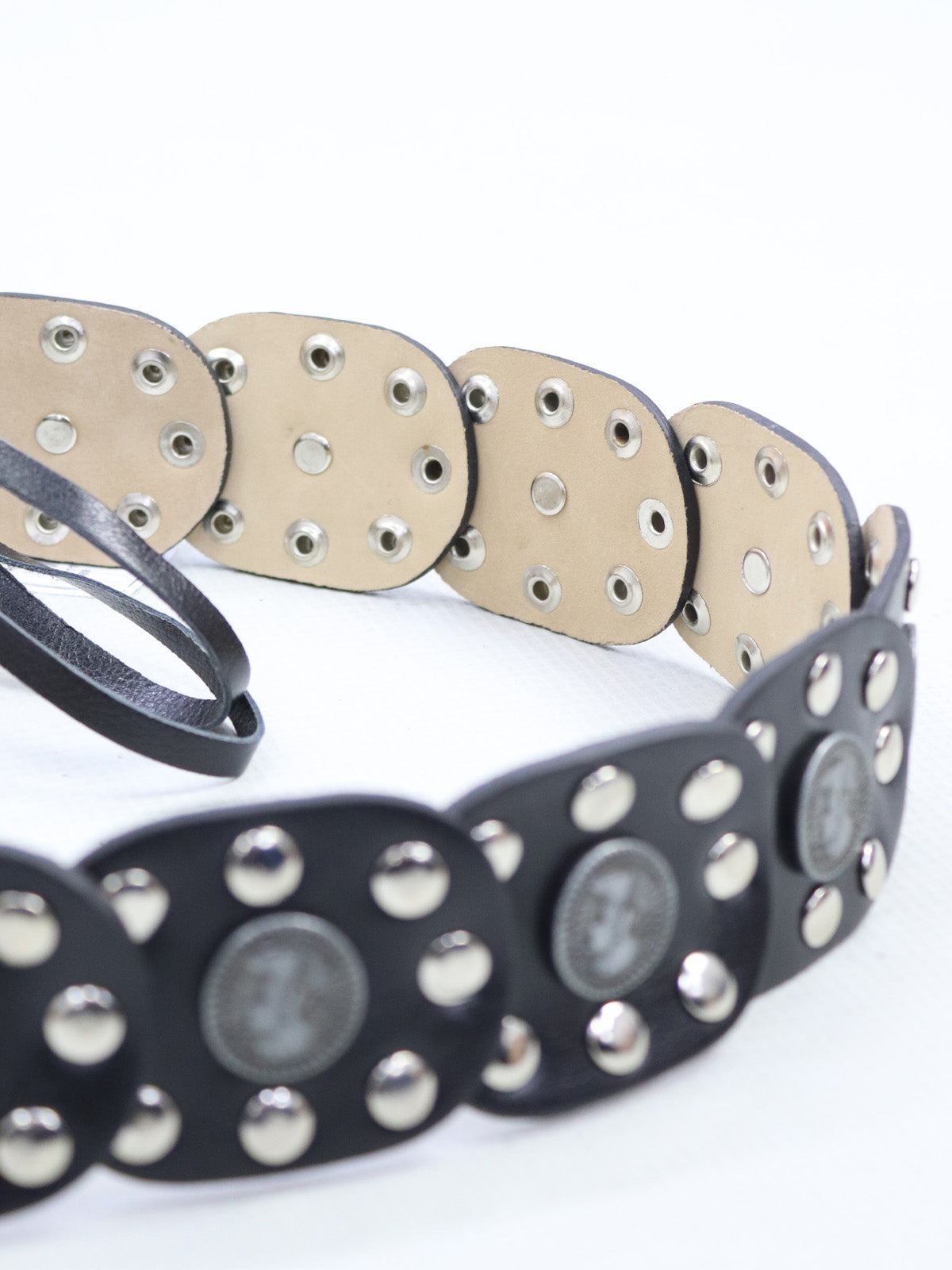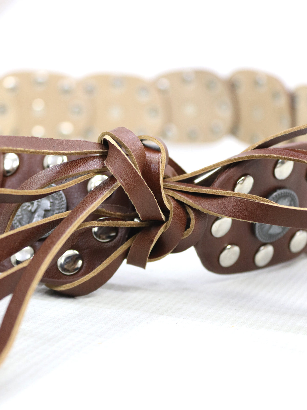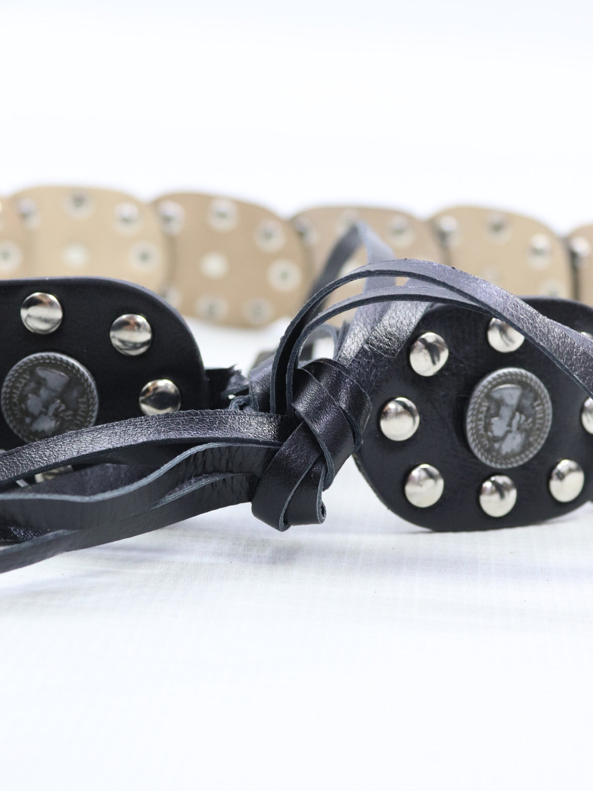 O Cinto Gaulle agrega estilo ao look. Em toda sua extensão ele possui aplicações de medalhas e tachas no tom níquel e ônix, com amarração por um cordão fino de couro nas duas extremidades, fazendo toda diferença ao combinar com peças mais clássicas ou mais estilosas.