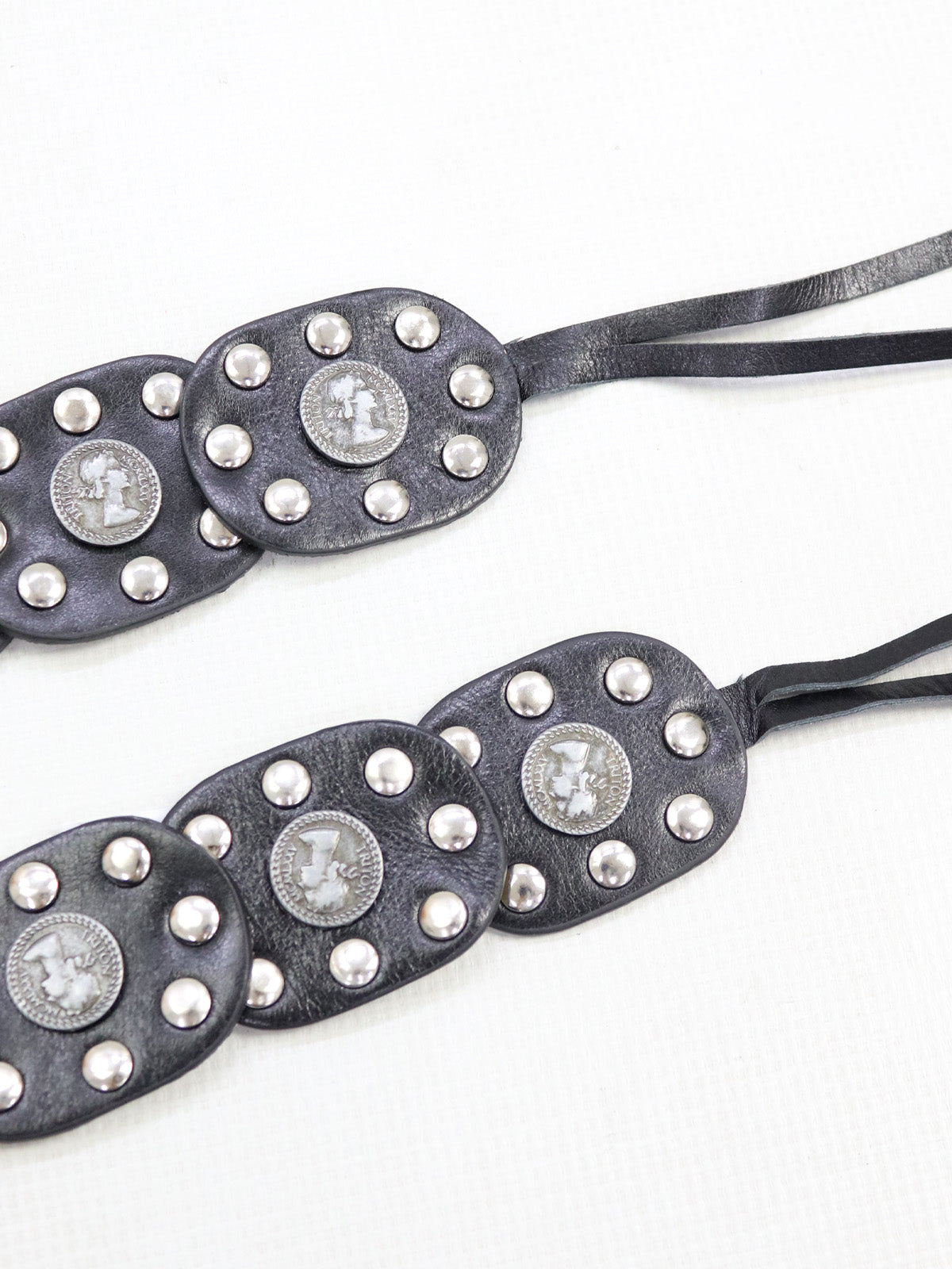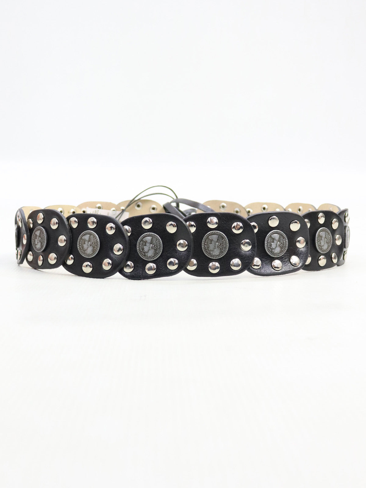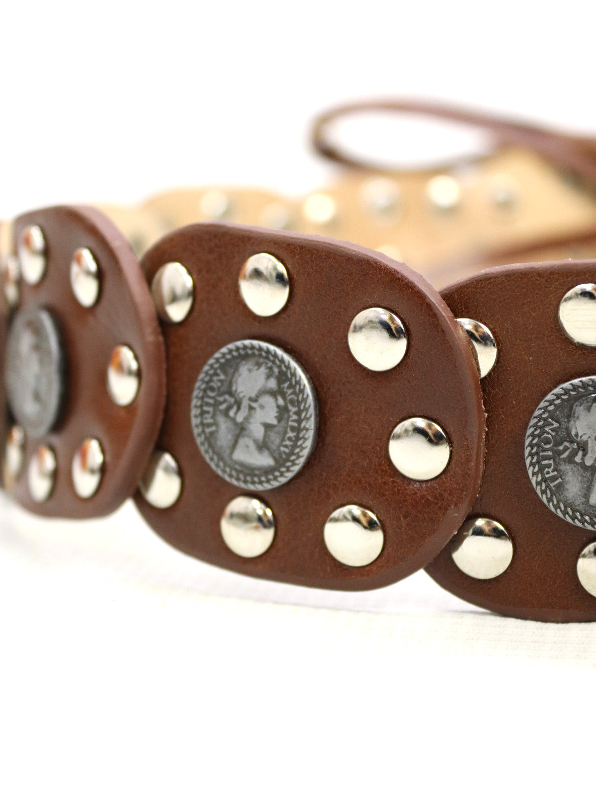 O Cinto Gaulle agrega estilo ao look. Em toda sua extensão ele possui aplicações de medalhas e tachas no tom níquel e ônix, com amarração por um cordão fino de couro nas duas extremidades, fazendo toda diferença ao combinar com peças mais clássicas ou mais estilosas.