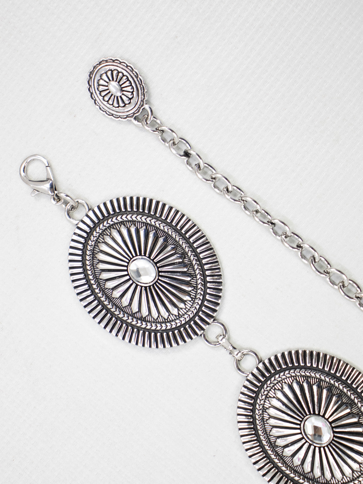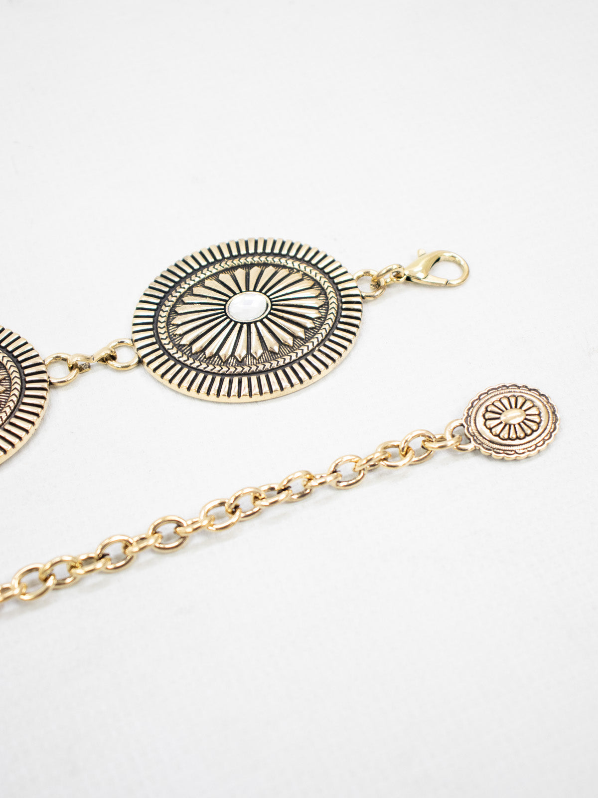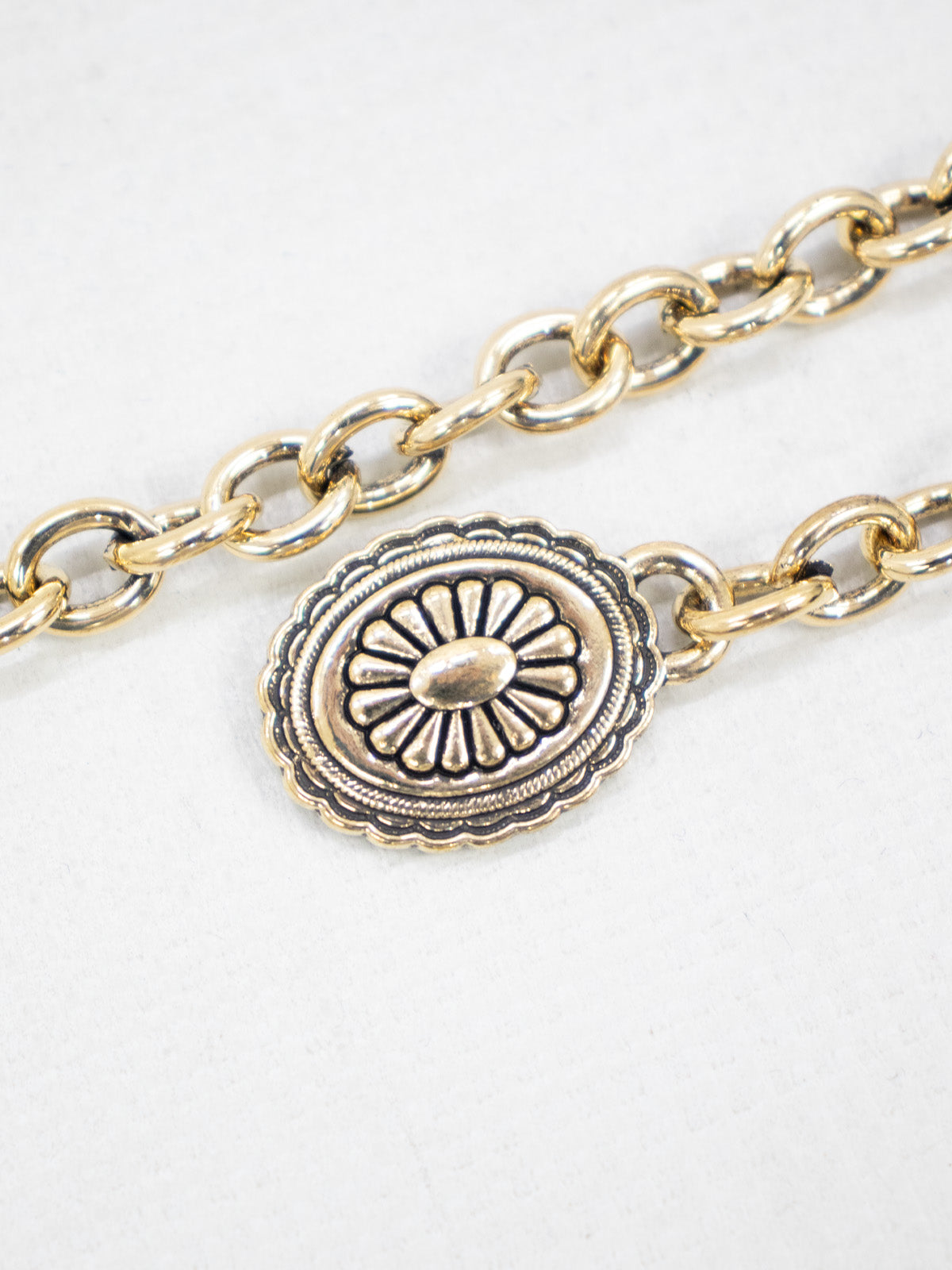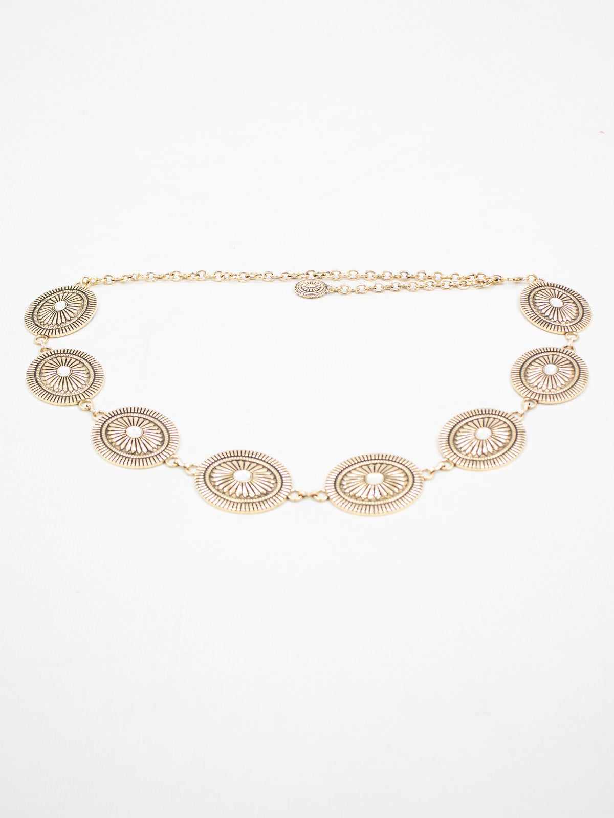 O Cinto de Corrente Moulins é a definição de elegância atemporal. Sua estrutura é delicada e imponente ao mesmo tempo, ao longo de sua extensão possui oito medalhas entrelaçadas, todas são trabalhadas, o fechamento é por gancho em uma das pontas, enquanto a outra extremidade é adornada com um pingente delicado que finaliza a peça com um toque de charme. Este cinto transforma o look, seja em um visual mais casual ou sofisticado.