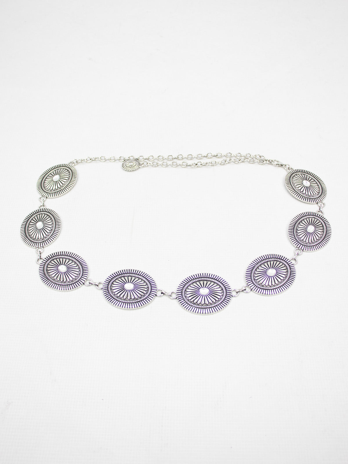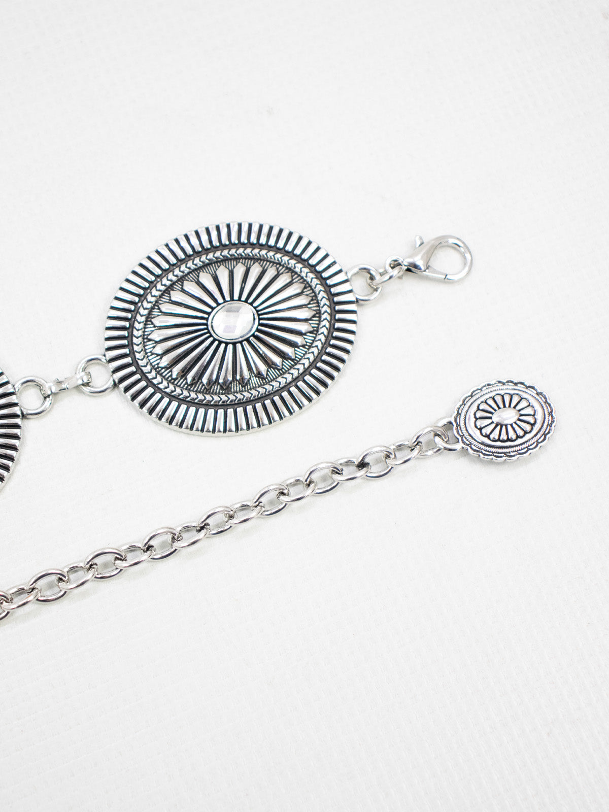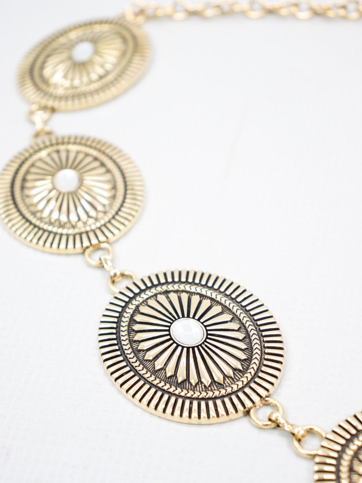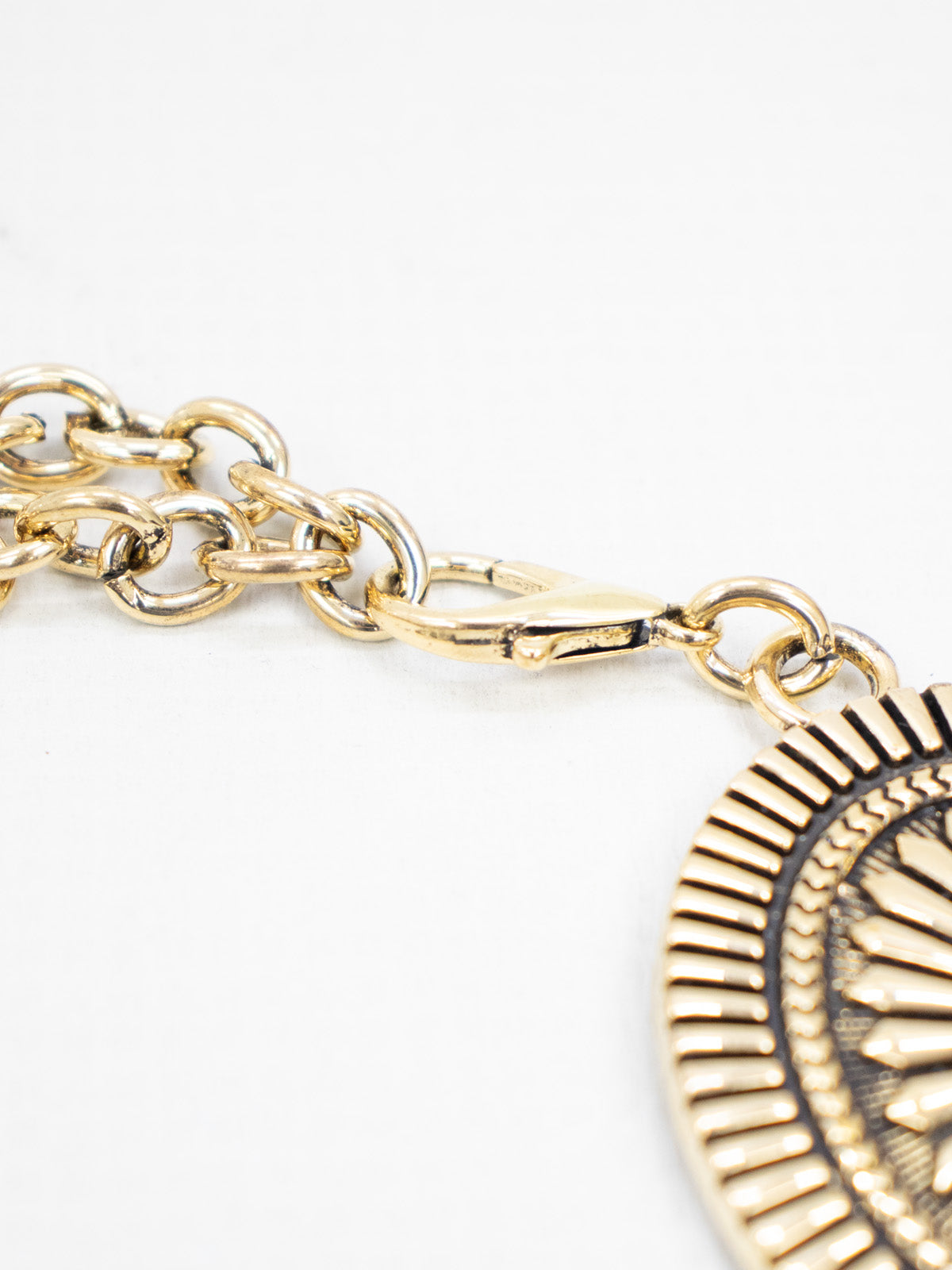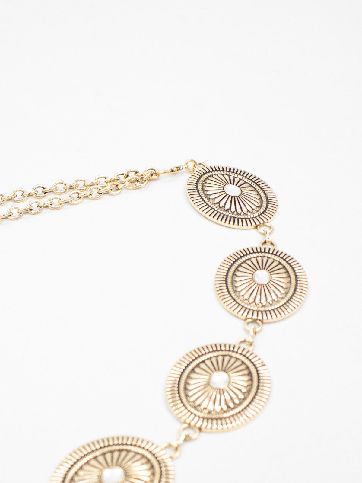 O Cinto de Corrente Moulins é a definição de elegância atemporal. Sua estrutura é delicada e imponente ao mesmo tempo, ao longo de sua extensão possui oito medalhas entrelaçadas, todas são trabalhadas, o fechamento é por gancho em uma das pontas, enquanto a outra extremidade é adornada com um pingente delicado que finaliza a peça com um toque de charme. Este cinto transforma o look, seja em um visual mais casual ou sofisticado.