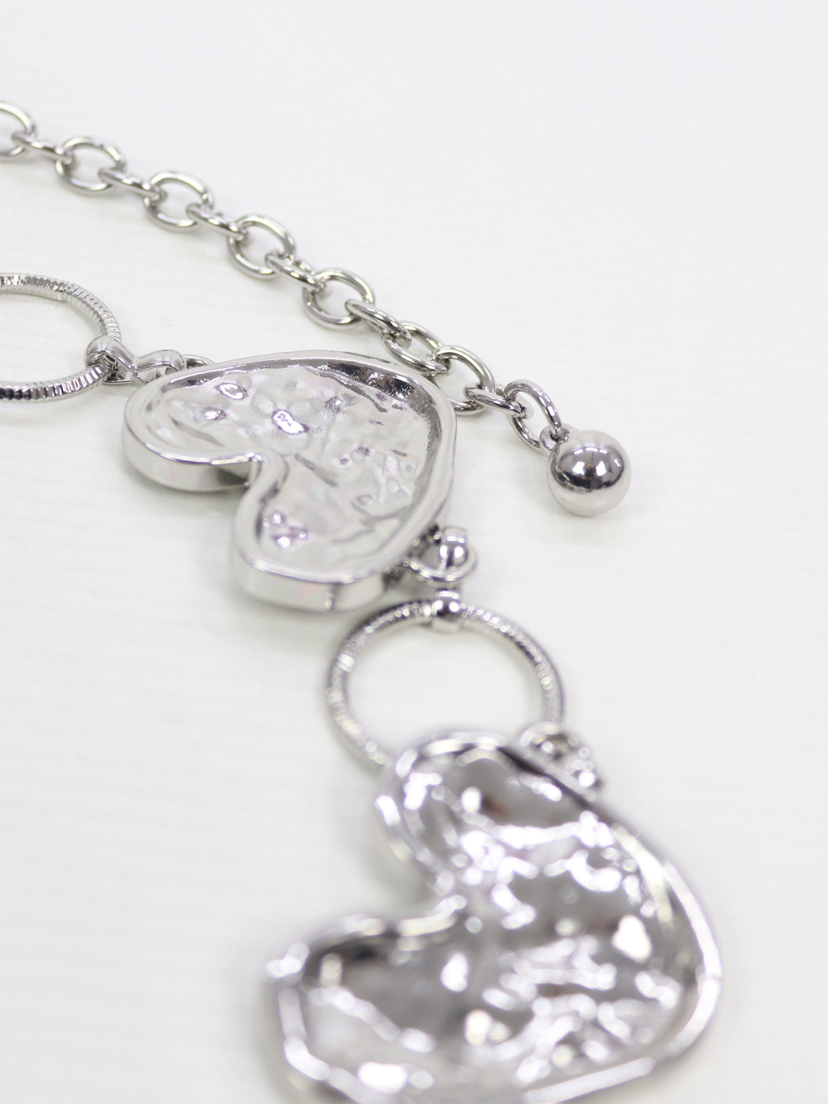 Nesta versão, eles aparecem com formato irregular e textura marcante, interligados por argolas metálicas que adicionam leveza e modernidade ao design.