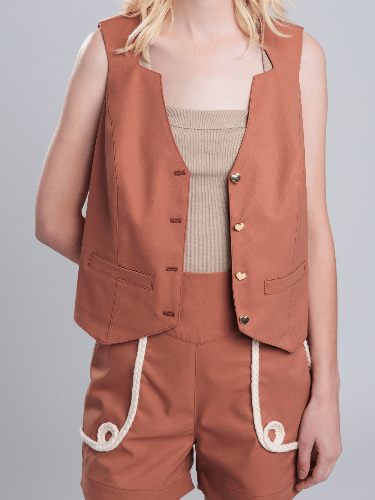 Na parte frontal, o modelo conta com fechamento por botões dourados em formato de coração, que adicionam charme e exclusividade à peça. Já nas costas, a amarração ajustável com fivela permite modelar o caimento conforme o corpo, garantindo ajuste perfeito e silhueta valorizada.