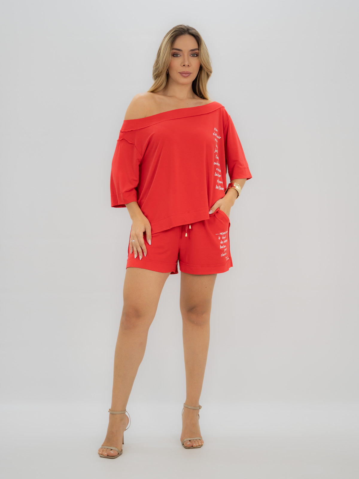 O Conjunto Mariane é formado por Blusa e Short. A Blusa tem comprimento curto e modelagem mais solta, possui um decote canoa trazendo um toque delicado e realçando o pescoço e uma parte dos ombros, a manga vai até a altura do cotovelo. Essa peça ganha um destaque por conta da sua estampa exclusiva na parte frontal fazendo desta peça uma única. A parte inferior do Conjunto é um Short que combina conforto e estilo em cada detalhe, seu comprimento é curto, sua modelagem é mais soltinha garantindo um caimento descomplicado, o cós é largo com elástico e possui amarração por cordão trazendo um ajuste perfeito, com bolsos na parte posterior, conta com uma estampa exclusiva na parte frontal sendo o destaque da peça, trazendo personalidade ao look.