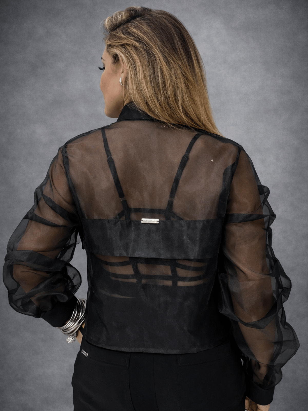 A Jaqueta Aura é confeccionada em organza transparente com leve brilho, trazendo uma proposta moderna e cheia de personalidade. Os franzidos ao longo da peça criam textura e volume, resultando em um visual marcante e sofisticado.
