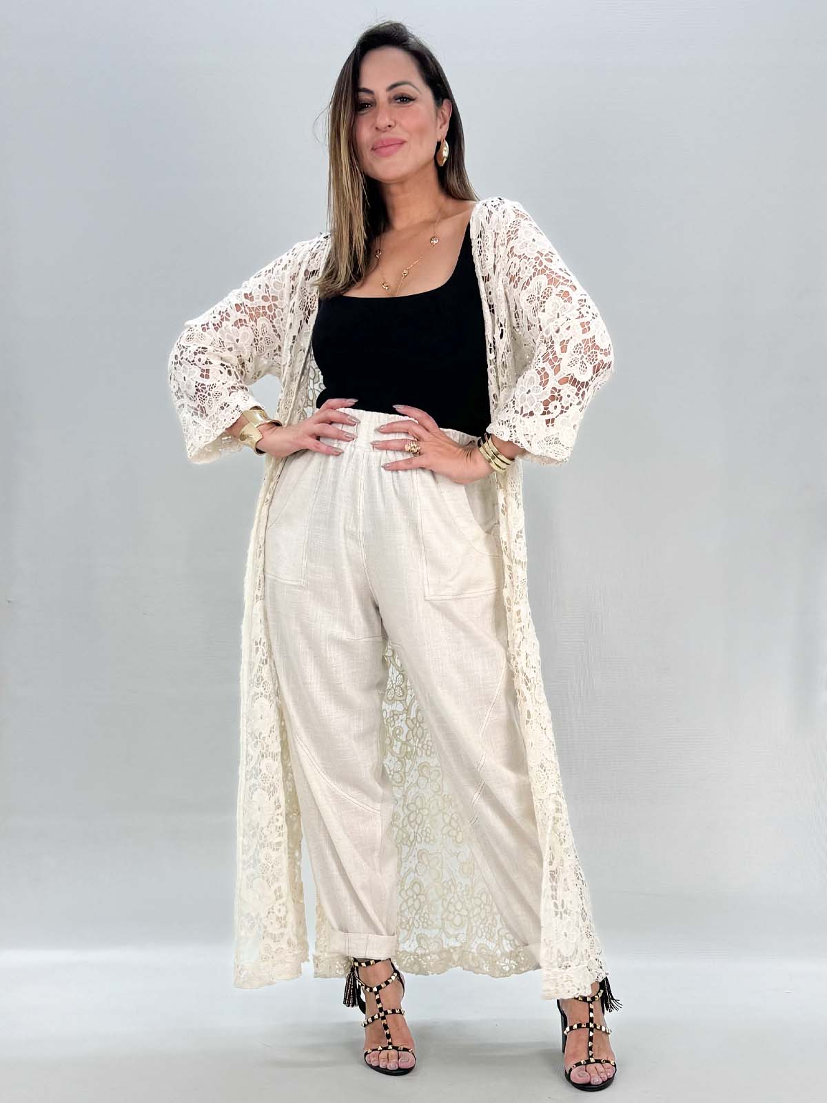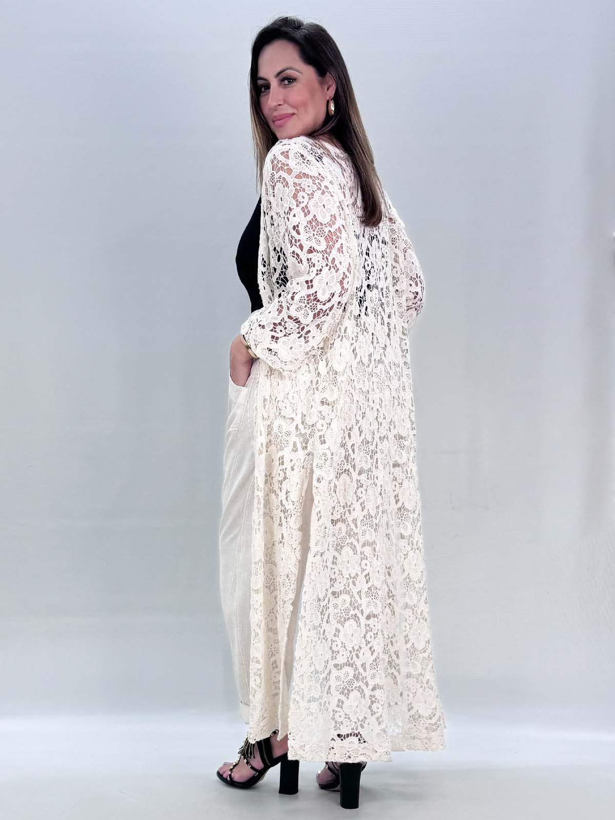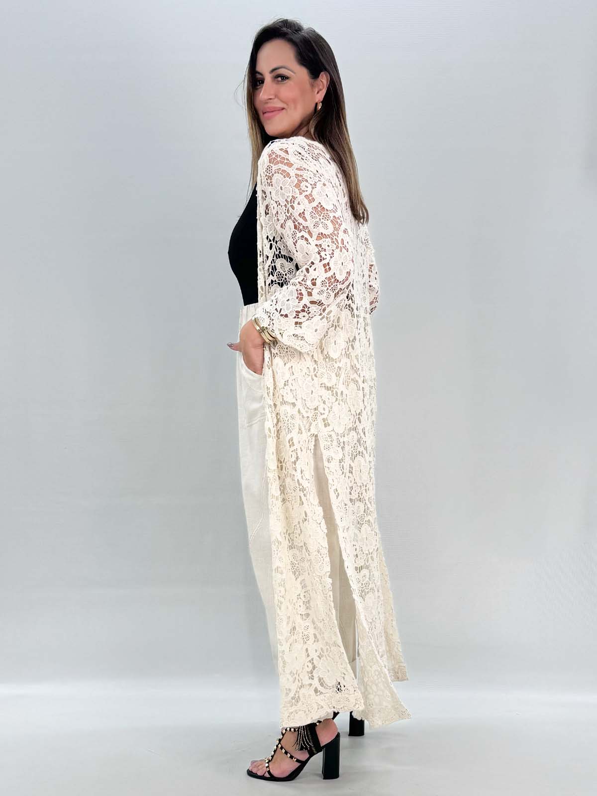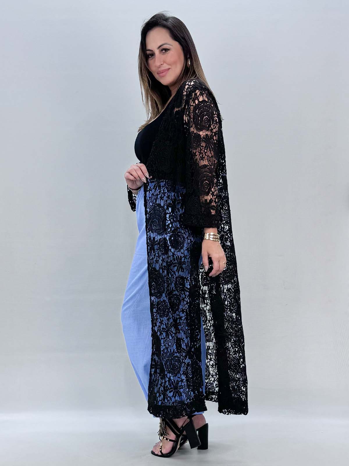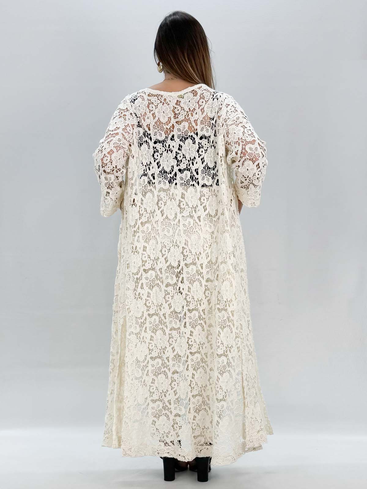 O Kimono Legrand é uma peça única e elegante, toda vazada por ter sido confeccionada em renda. Ela tem uma modelagem longa e mais solta no corpo, com mangas 7/8 possui fenda nas laterais, ela muda o visual do look, podendo ser usada com uma outra peça mais sequinha por baixo ou em um momento descontraído por cima de biquini ou maiô.