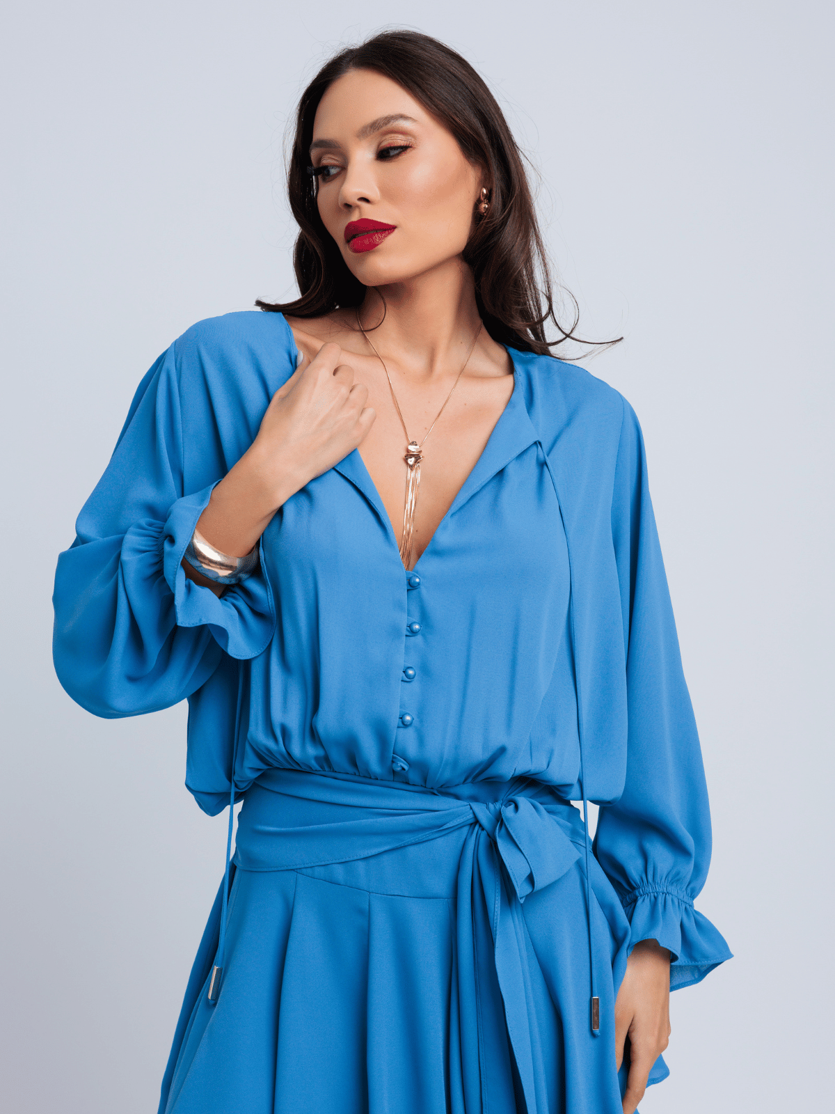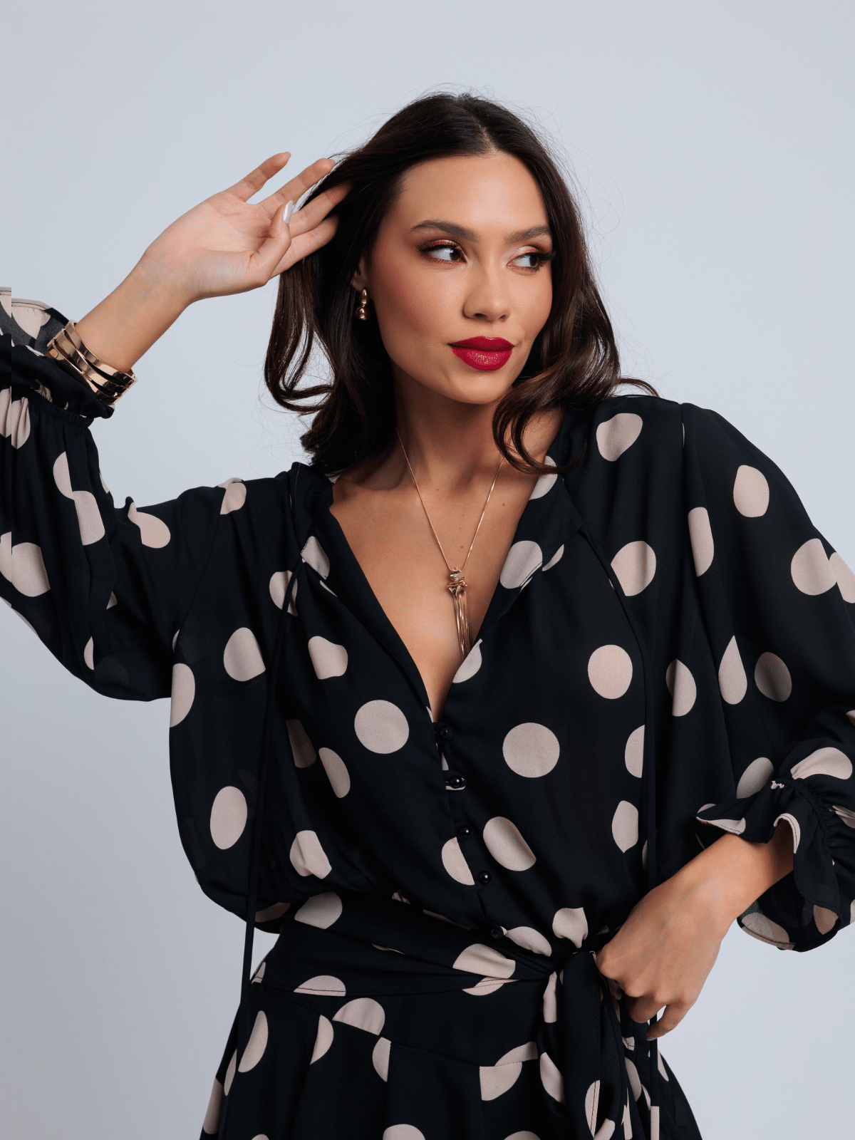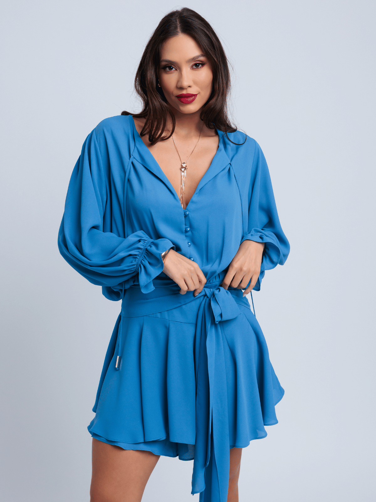 Confeccionado em crepe georgette superfluído, o modelo possui recortes e volumes estrategicamente trabalhados que valorizam a silhueta com leveza.