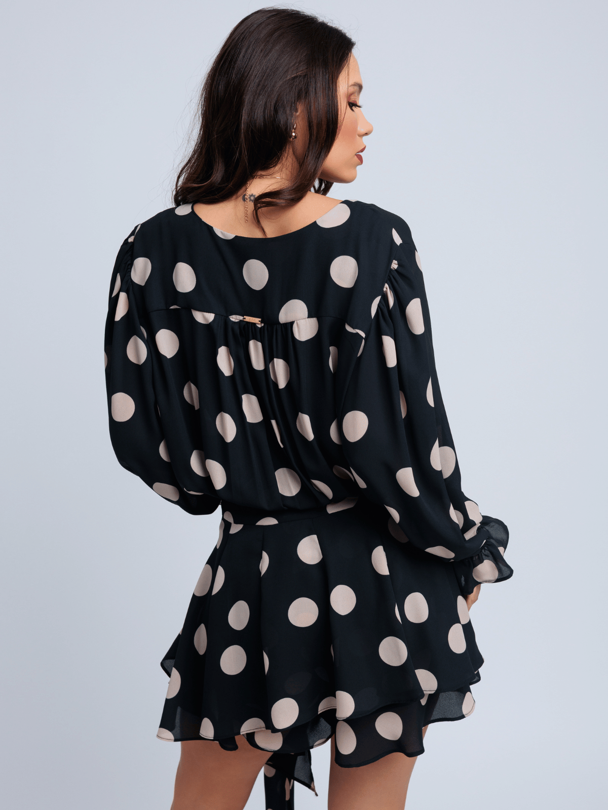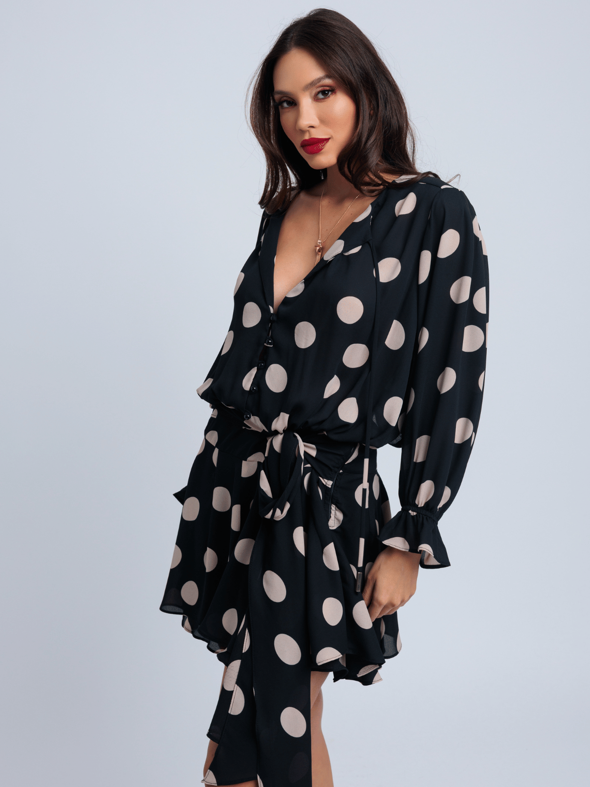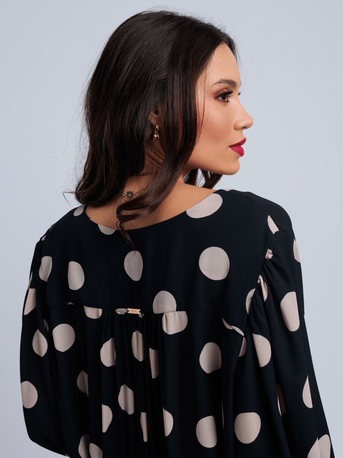 Confeccionado em crepe georgette superfluído, o modelo possui recortes e volumes estrategicamente trabalhados que valorizam a silhueta com leveza.