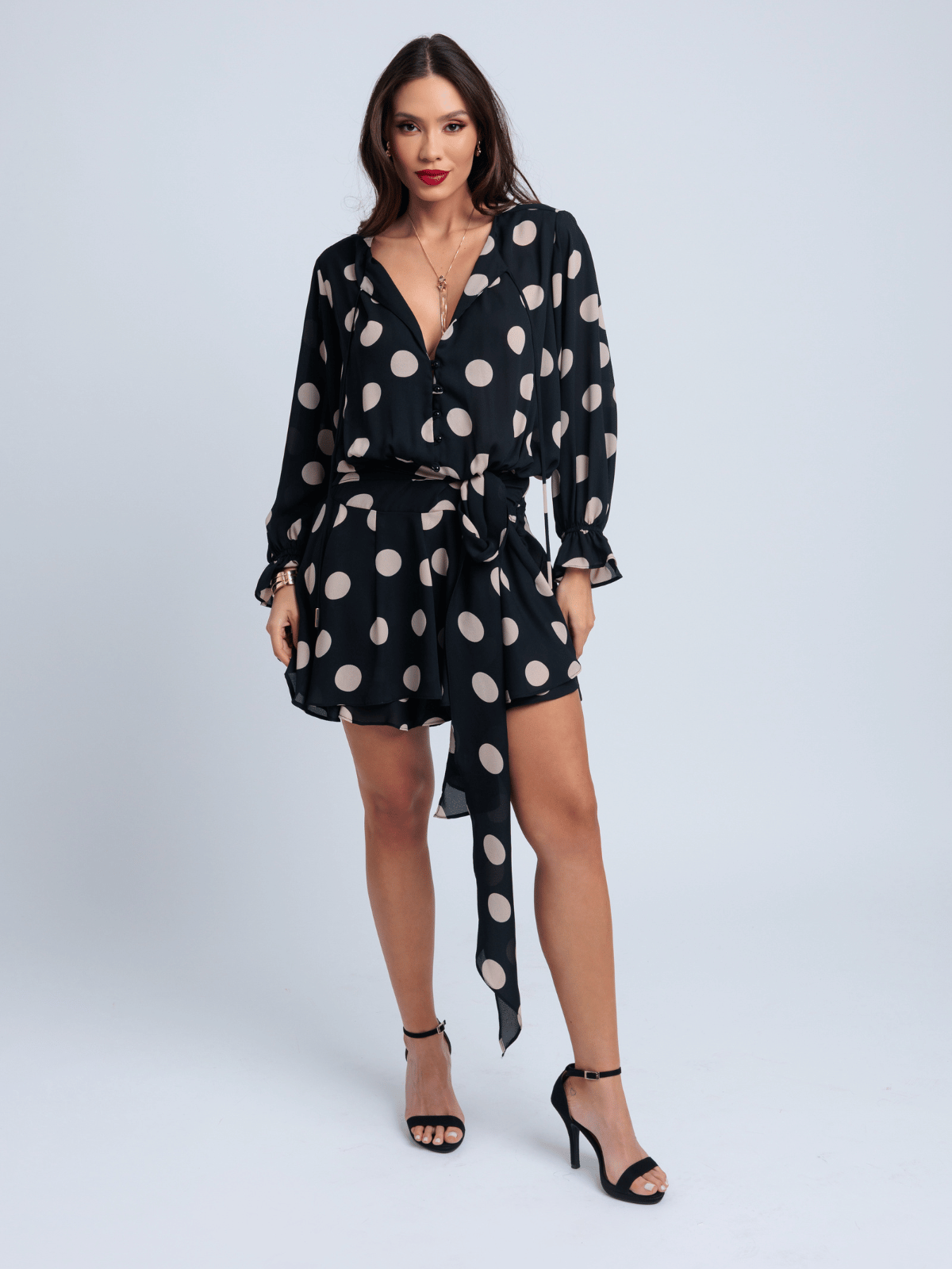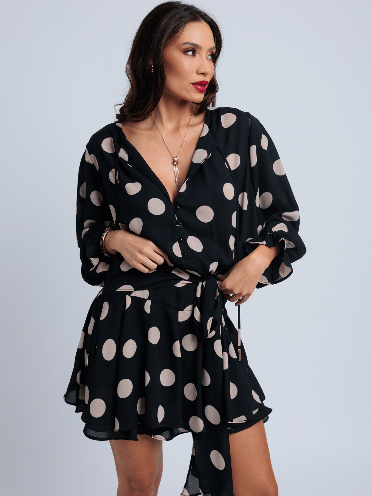 A parte superior é ampla e confortável, enquanto o shorts possui godê suave que cria um efeito dançante e surpreendente — visto de frente, ninguém diz que se trata de um macaquinho. O ajuste por amarração na cintura permite regular a altura, garantindo praticidade e caimento impecável.