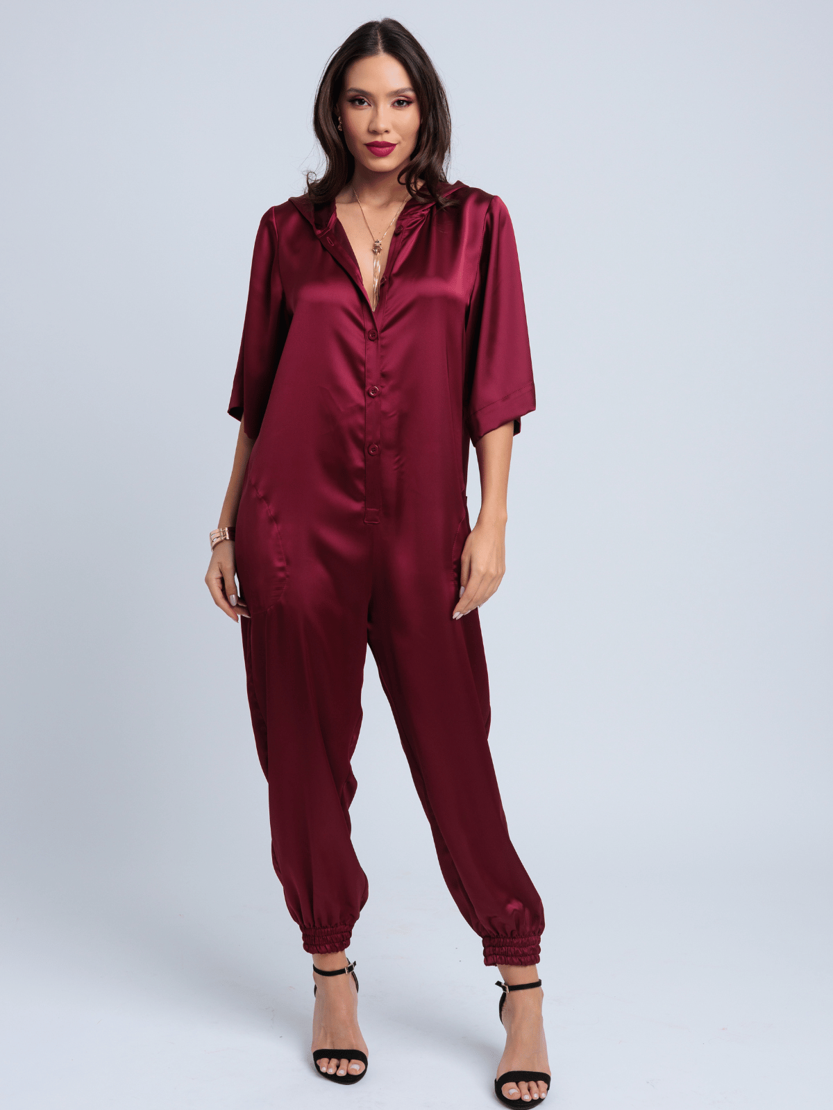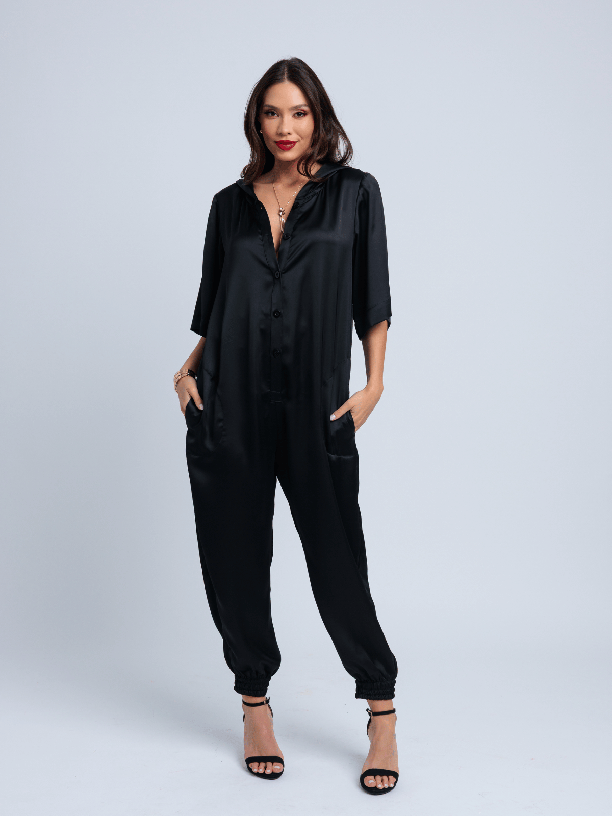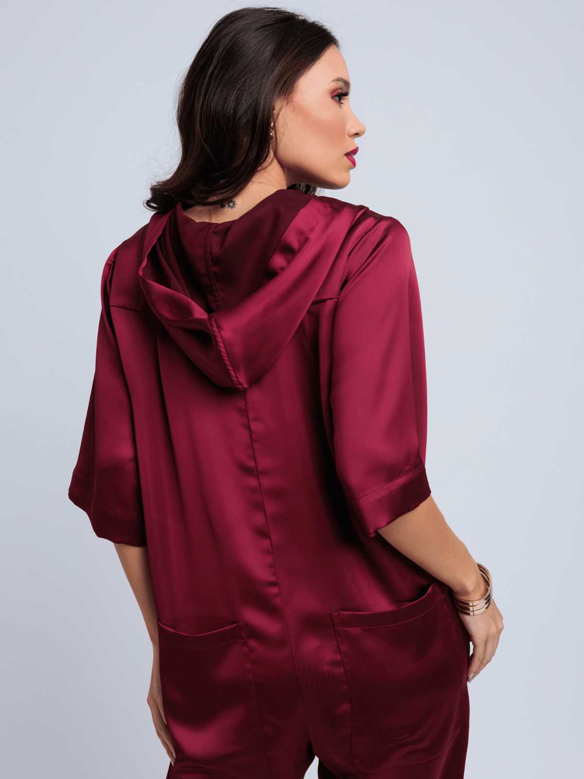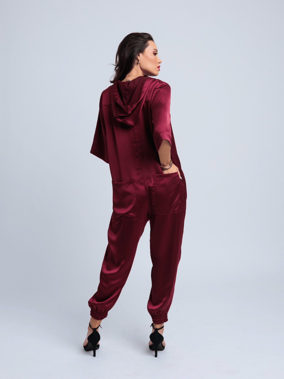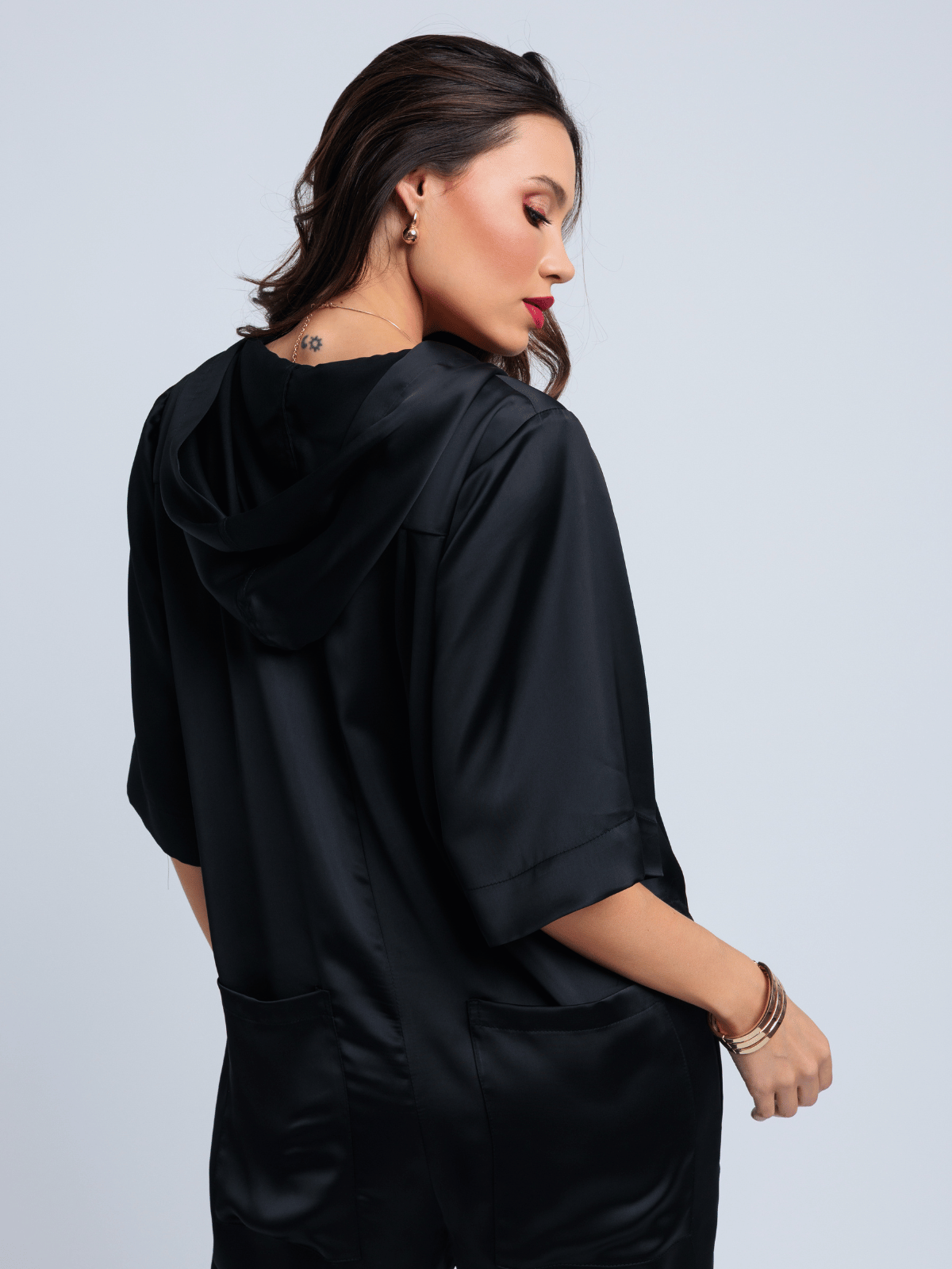 Sua modelagem harem, unida ao toque urbano do capuz, cria um visual ousado e nada convencional, equilibrando exuberância e conforto em uma peça única. É moderno, expressivo e pensado para quem gosta de sair do óbvio com sofisticação.