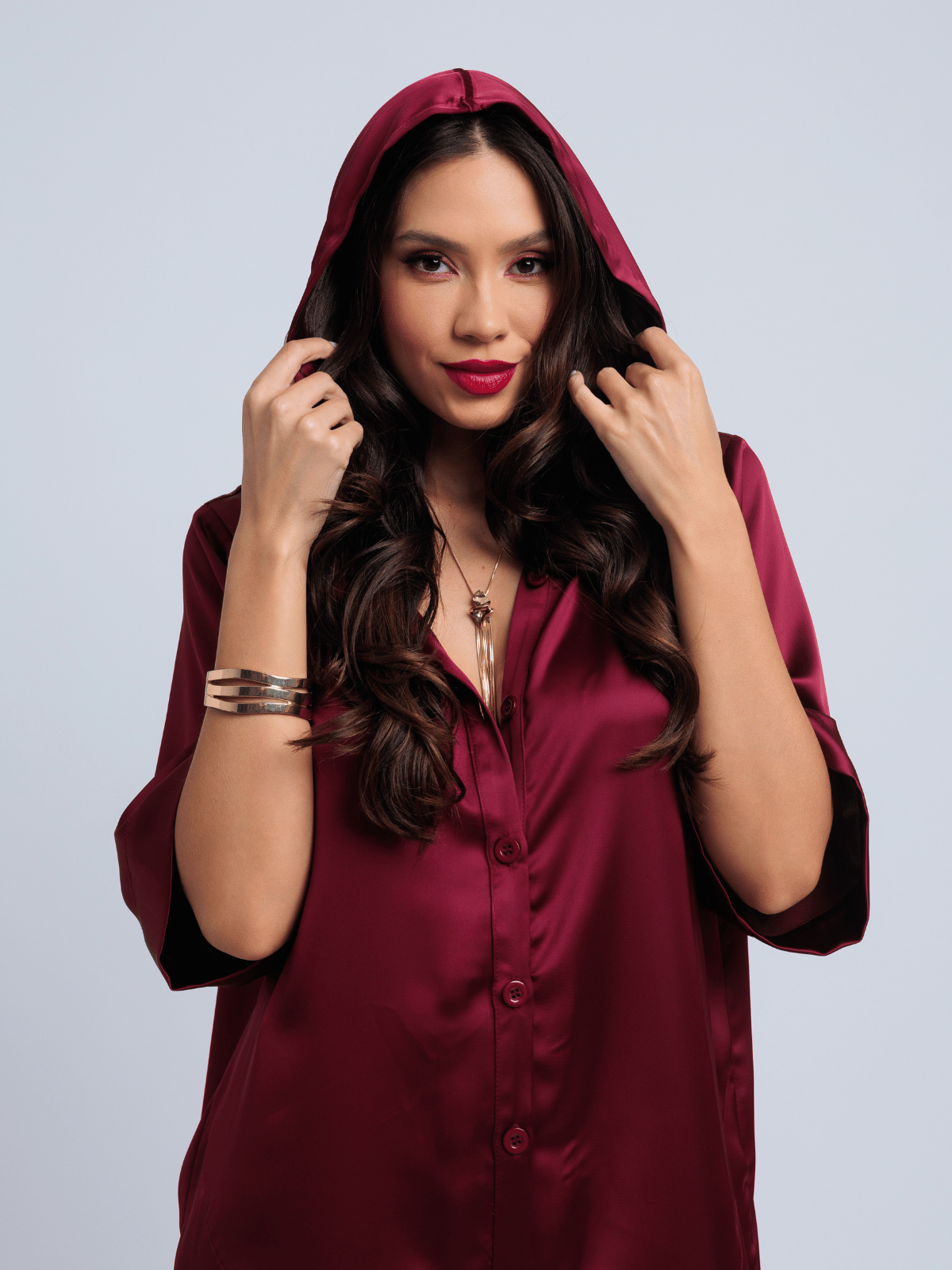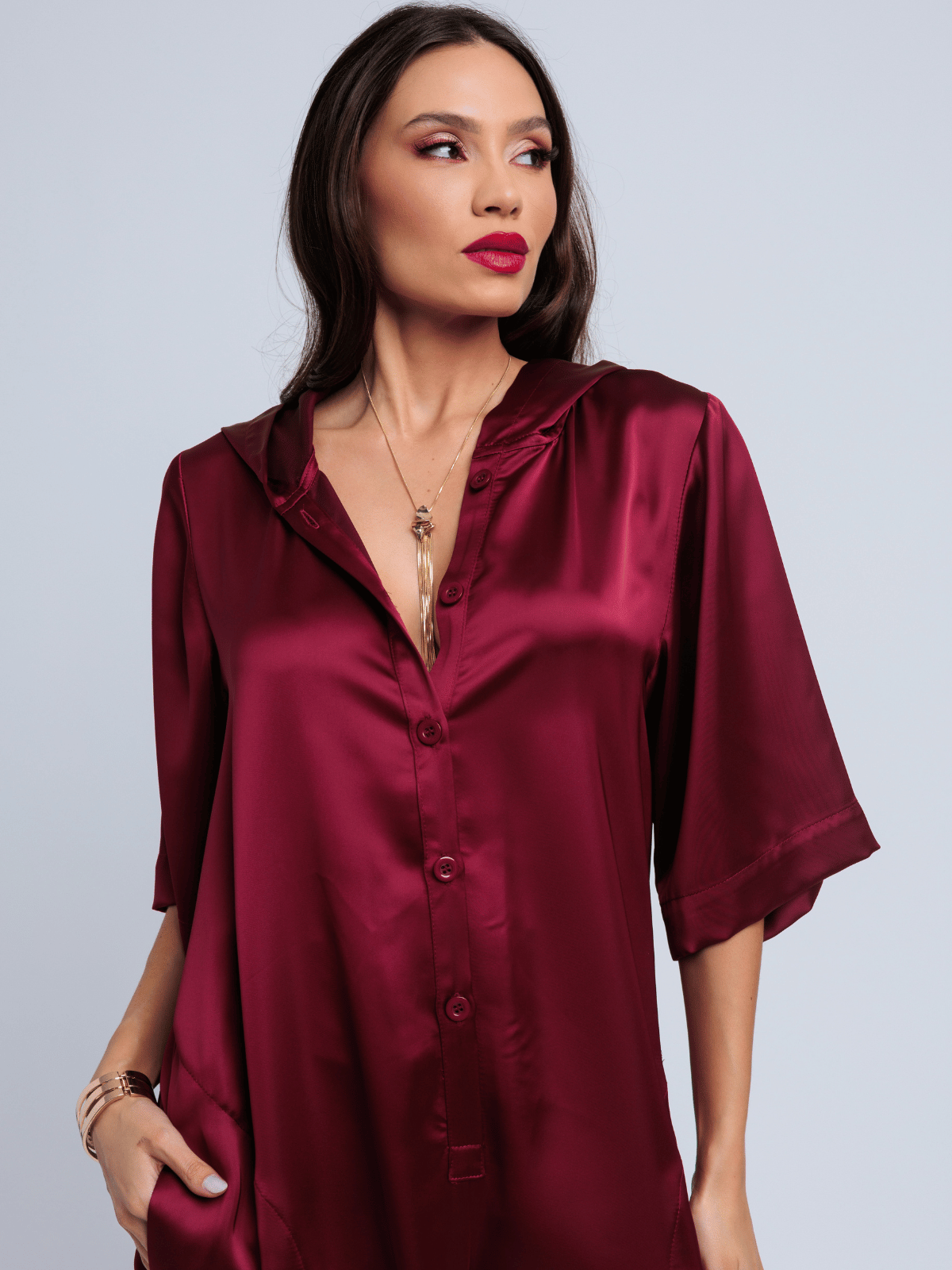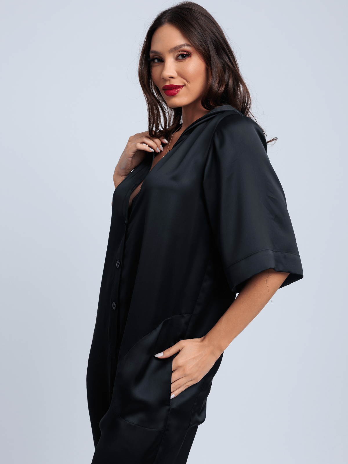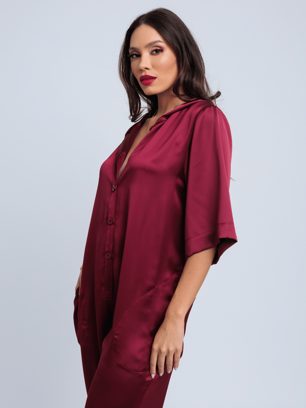 Características do tecido: Acetinamento macio, toque frio, caimento denso e elegante; brilho suave no lado externo e textura fosca e levemente creponada no lado interno
