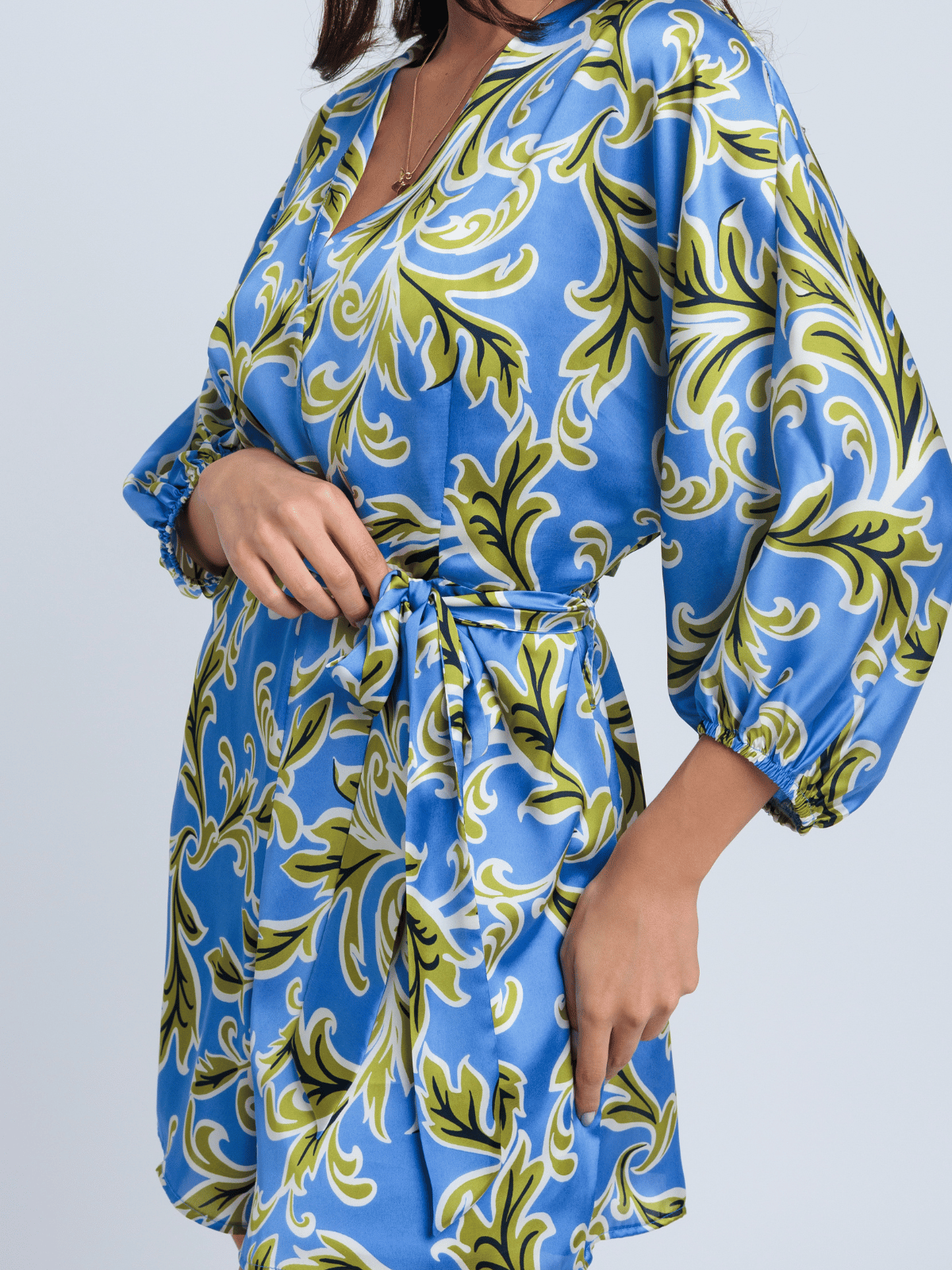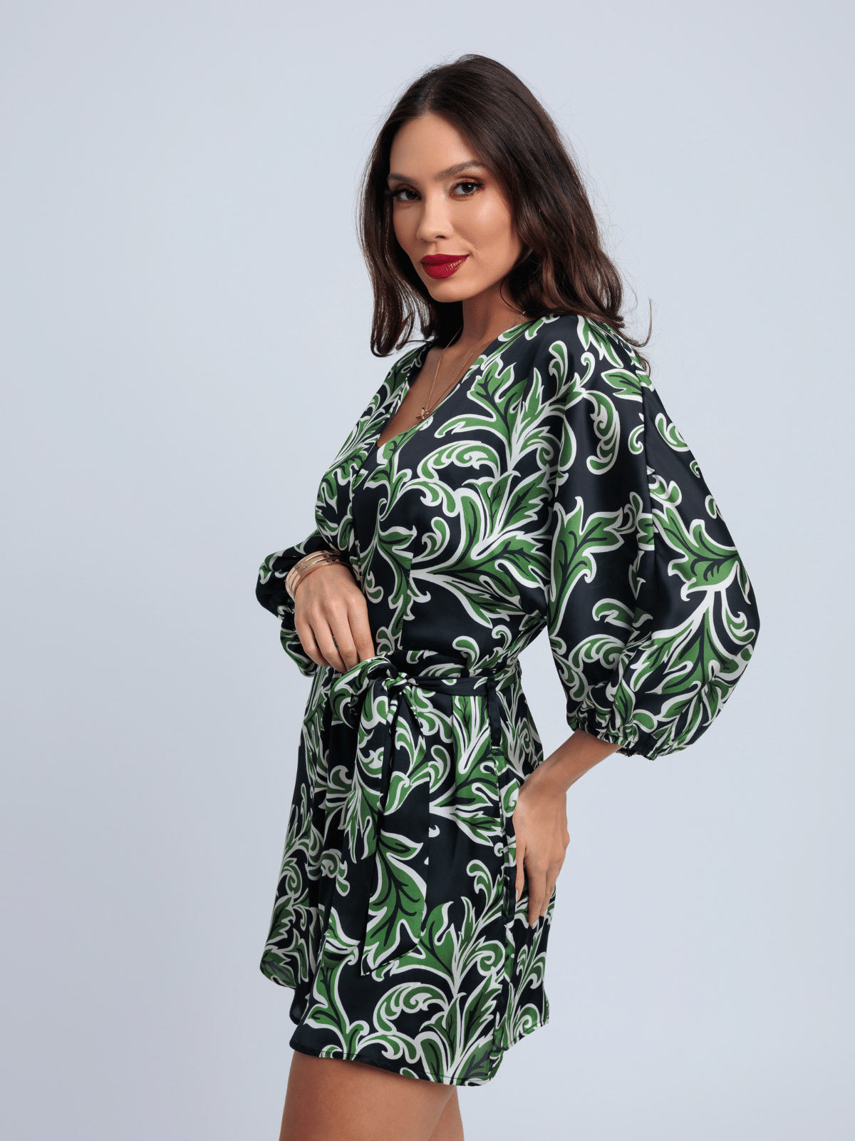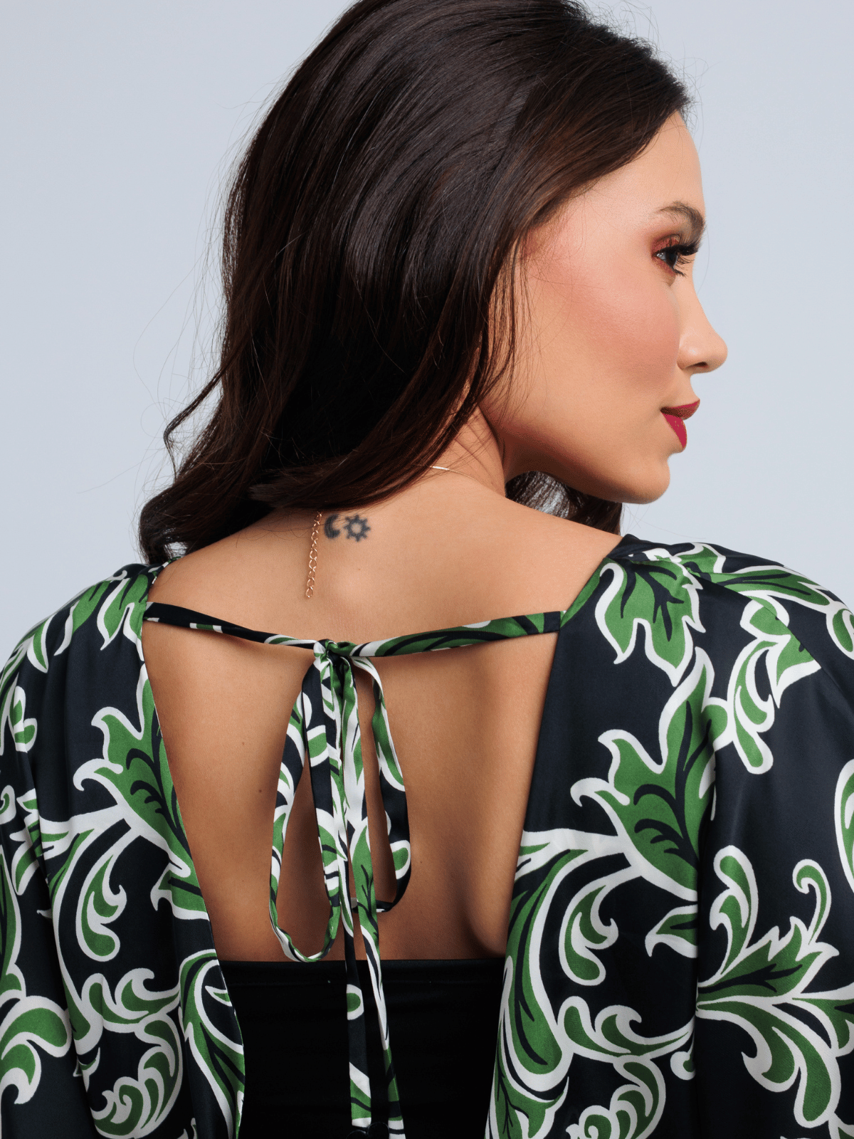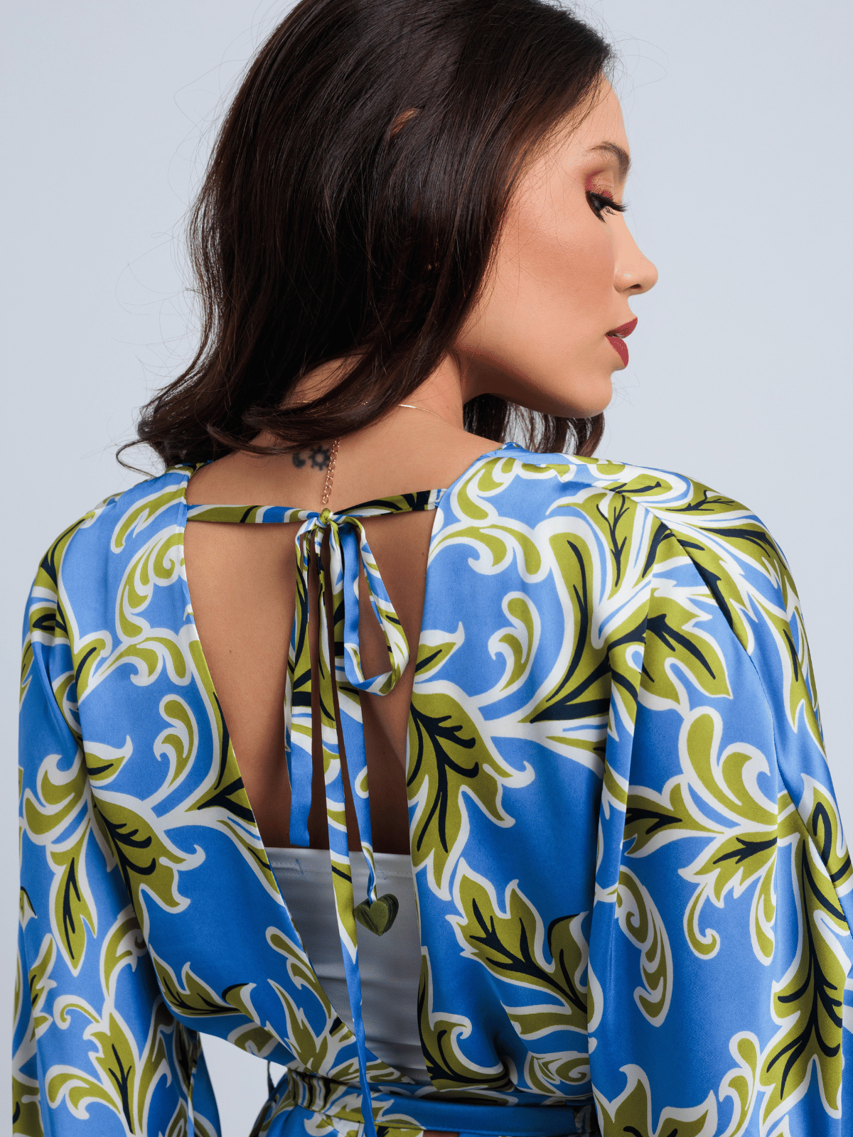O modelo apresenta decote profundo, costas abertas, manga morcego com punho elástico e faixa para acinturar a silhueta com delicadeza. A amarração nas costas traz uma ponteira acrílica em formato de coração — um detalhe especial que valoriza ainda mais a peça.
