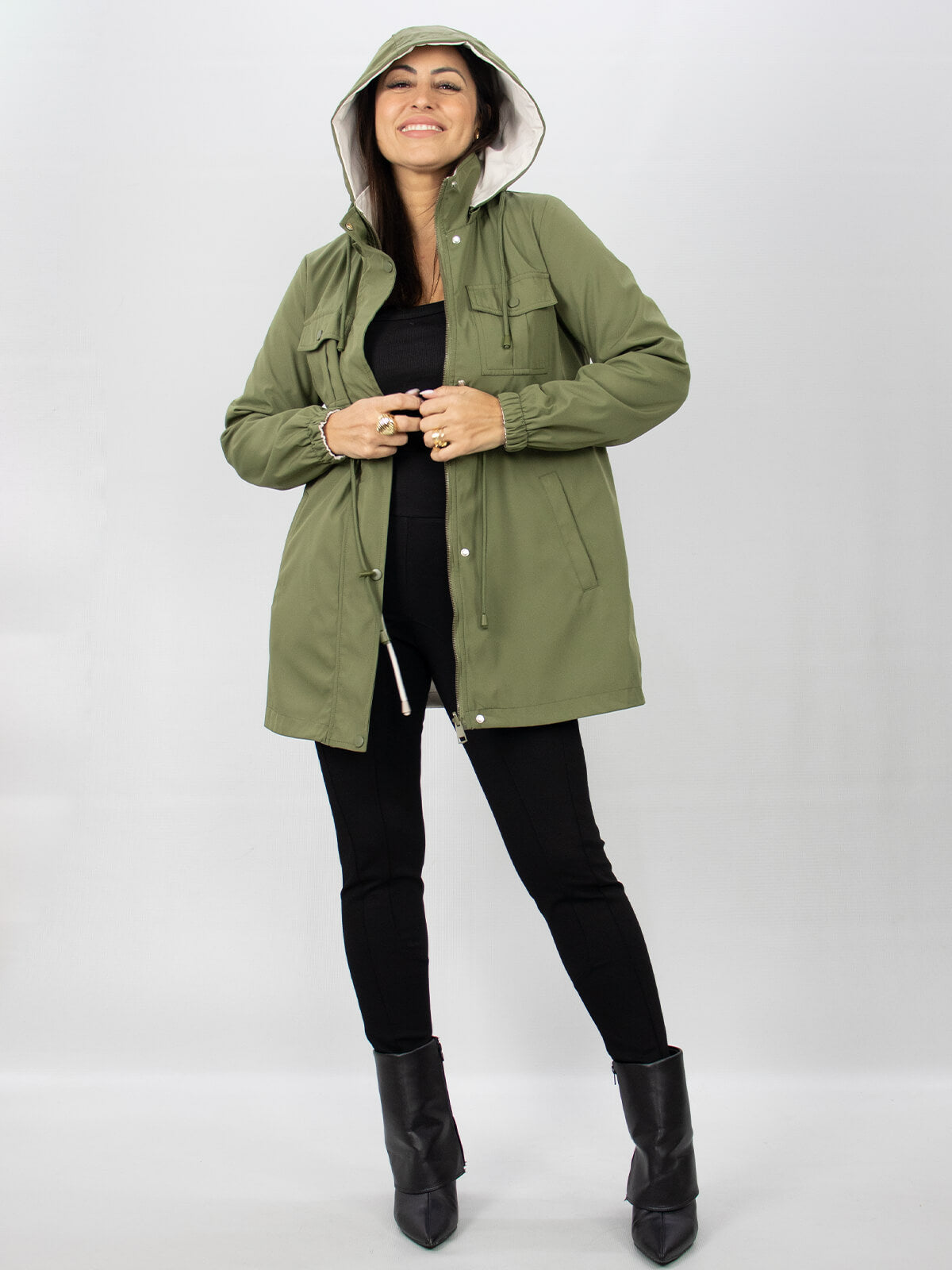 A Parka Analiz possui um toque macio e confortável. Sua modelagem é levemente solta com regulagem na cintura para ajuste, seu comprimento é médio, possui bolsos nas laterais e superior frontal, sua manga é longa e conta com elástico no punho, possui capuz com cordão de ajuste, seu fechamento é frontal por zíper tratorado e botão de pressão, é possível usa-la dos dois lados por ser dupla face e, um deles fica em contraste por conta das cores. Uma peça que combina elegância, praticidade e conforto.