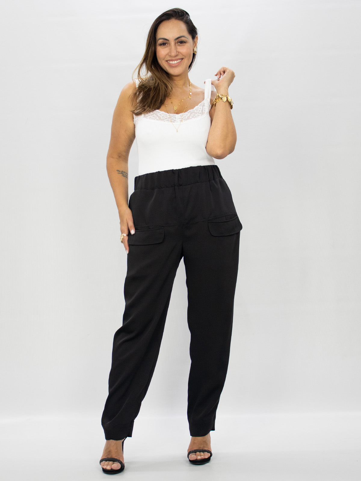 A Regata Cler possui um toque macio e é mais ajustada ao corpo, sua modelagem é curta, possui decote frontal quadrado com detalhe de renda, é um modelo atemporal, fácil para compor looks versáteis, podendo ser usada com camisa, blazer, criando um look clean e moderno mas cheio de estilo.