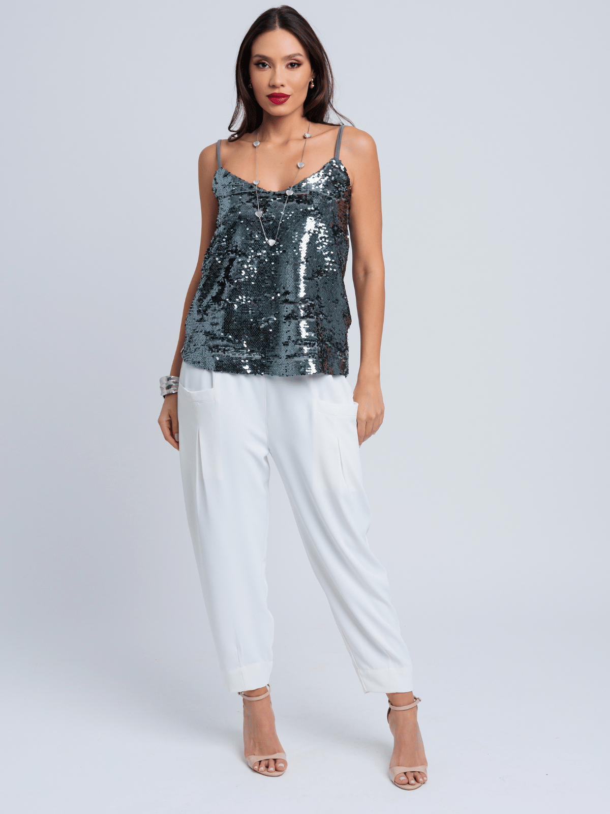 A Regata Sartori combina o brilho sofisticado do paetê com o conforto do jersey, criando uma peça luminosa, moderna e versátil.