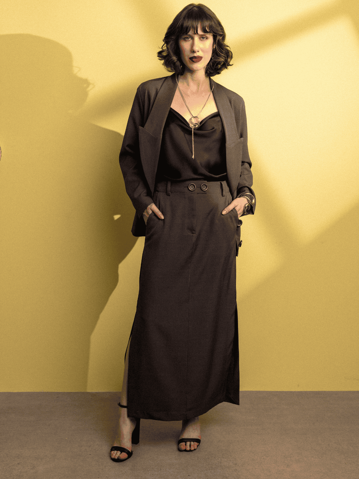Produção elegante para noite: use com body de manga longa, cinto estruturado e salto fino.