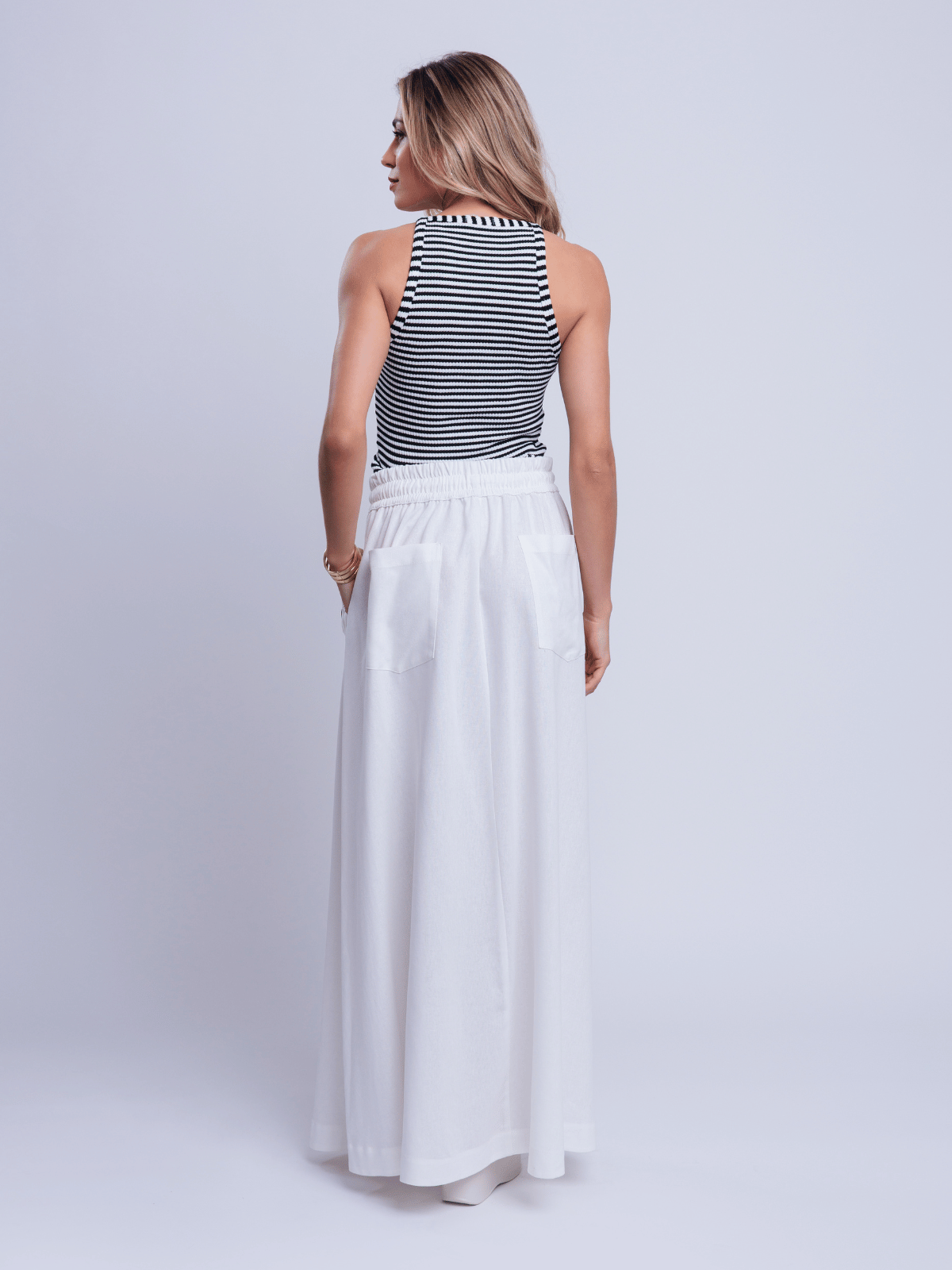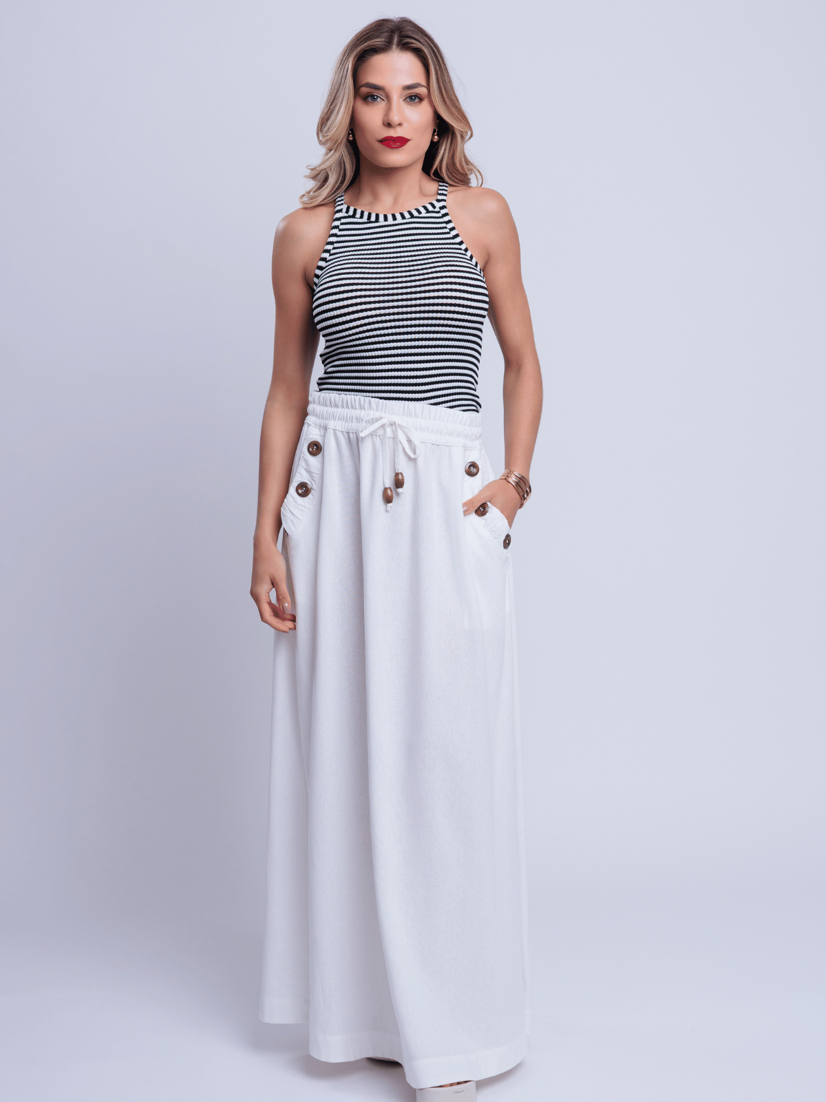 Com cós elástico e cordão ajustável, a peça garante conforto absoluto e adaptação ao corpo. Versátil e atemporal, é perfeita para composições elegantes de verão ou produções casuais sofisticadas.