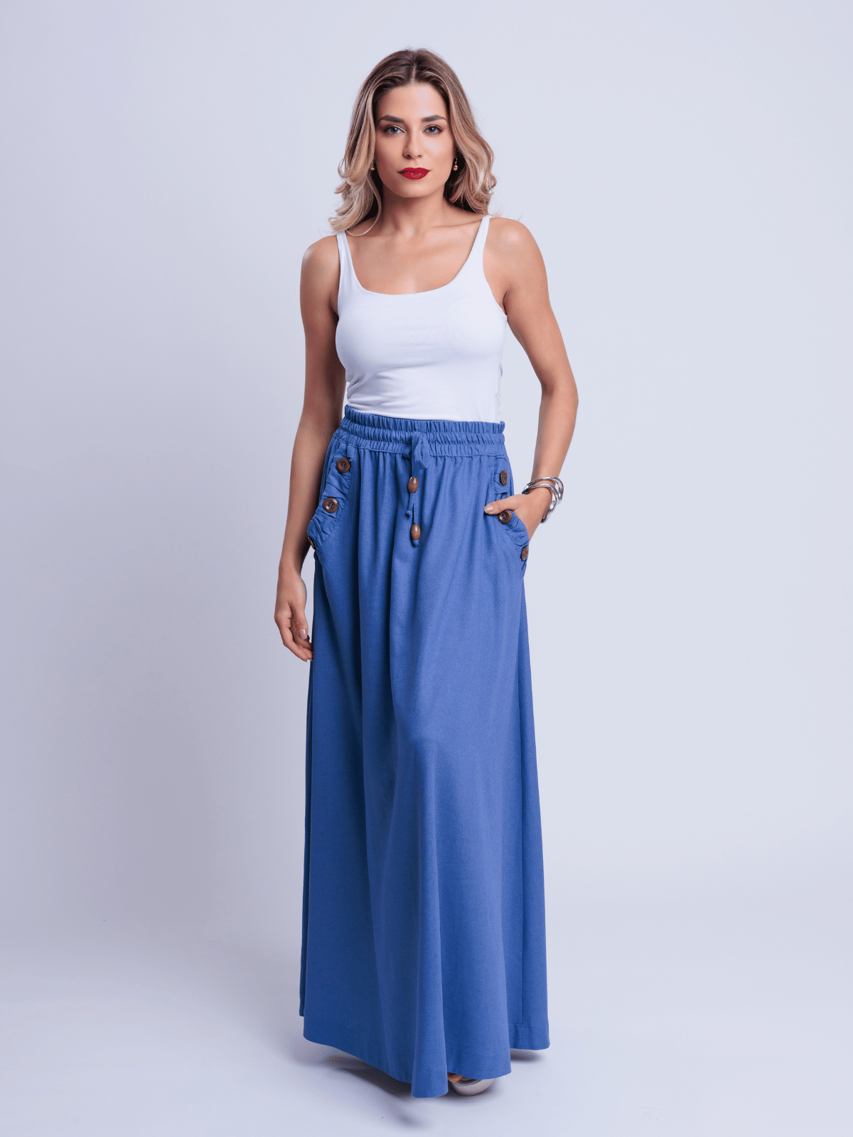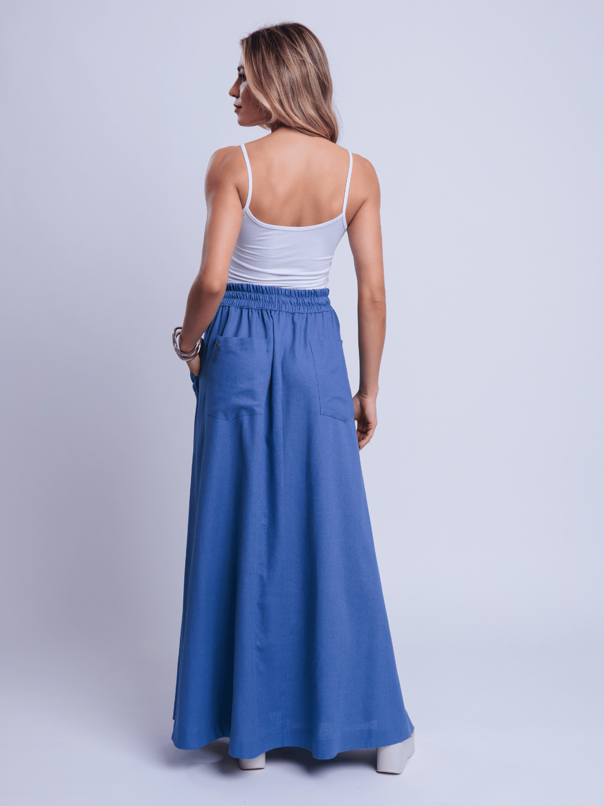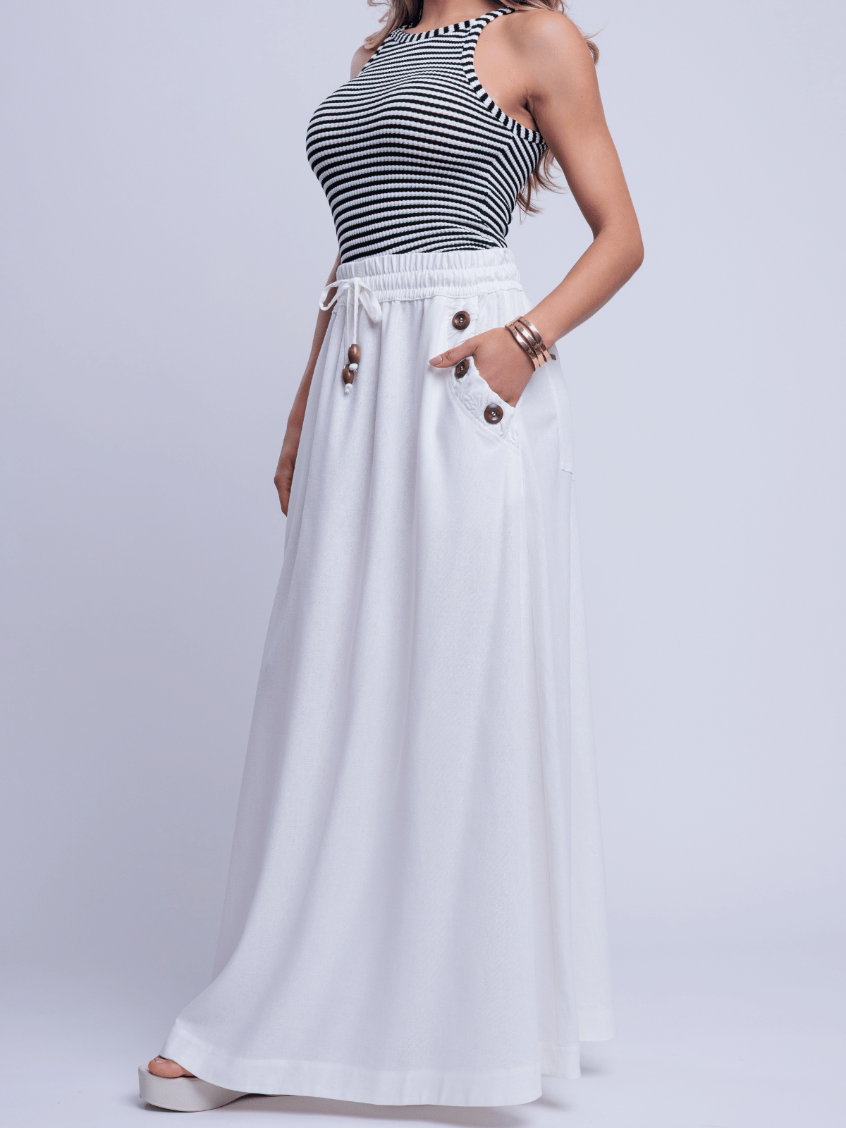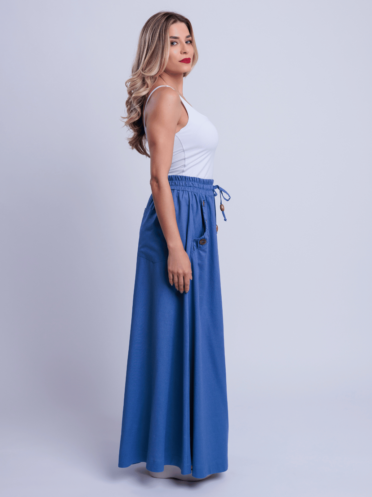 A Saia Ayane traduz elegância natural ao combinar a nobreza do blend de linho com viscose, proporcionando estrutura e um caimento sofisticado. A modelagem longa e fluida valoriza o movimento da peça, criando uma silhueta leve e elegante.