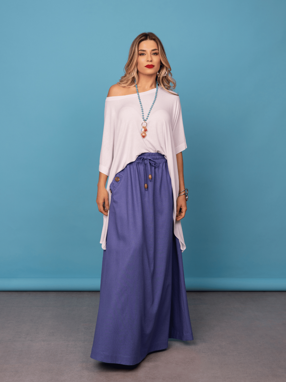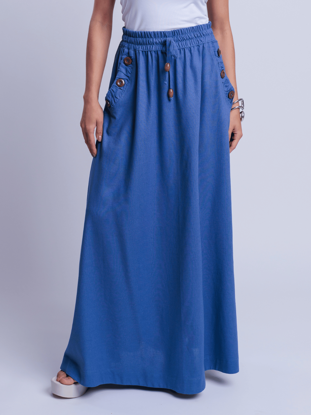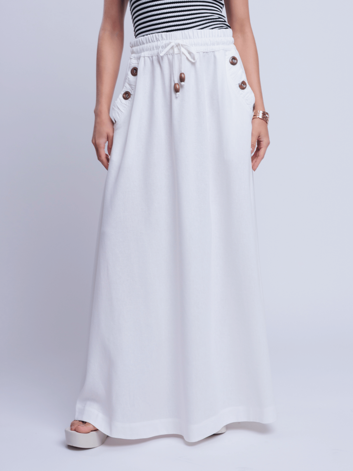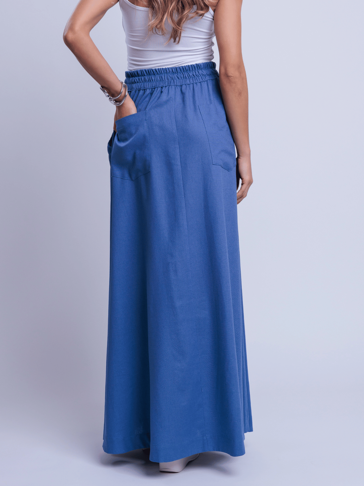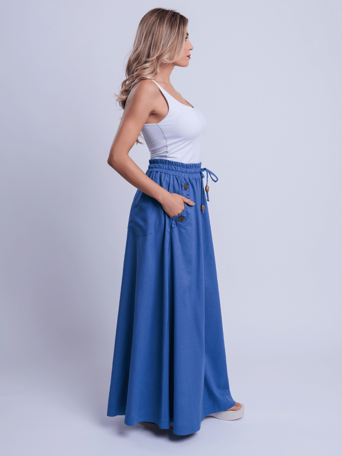 A Saia Ayane traduz elegância natural ao combinar a nobreza do blend de linho com viscose, proporcionando estrutura e um caimento sofisticado. A modelagem longa e fluida valoriza o movimento da peça, criando uma silhueta leve e elegante.