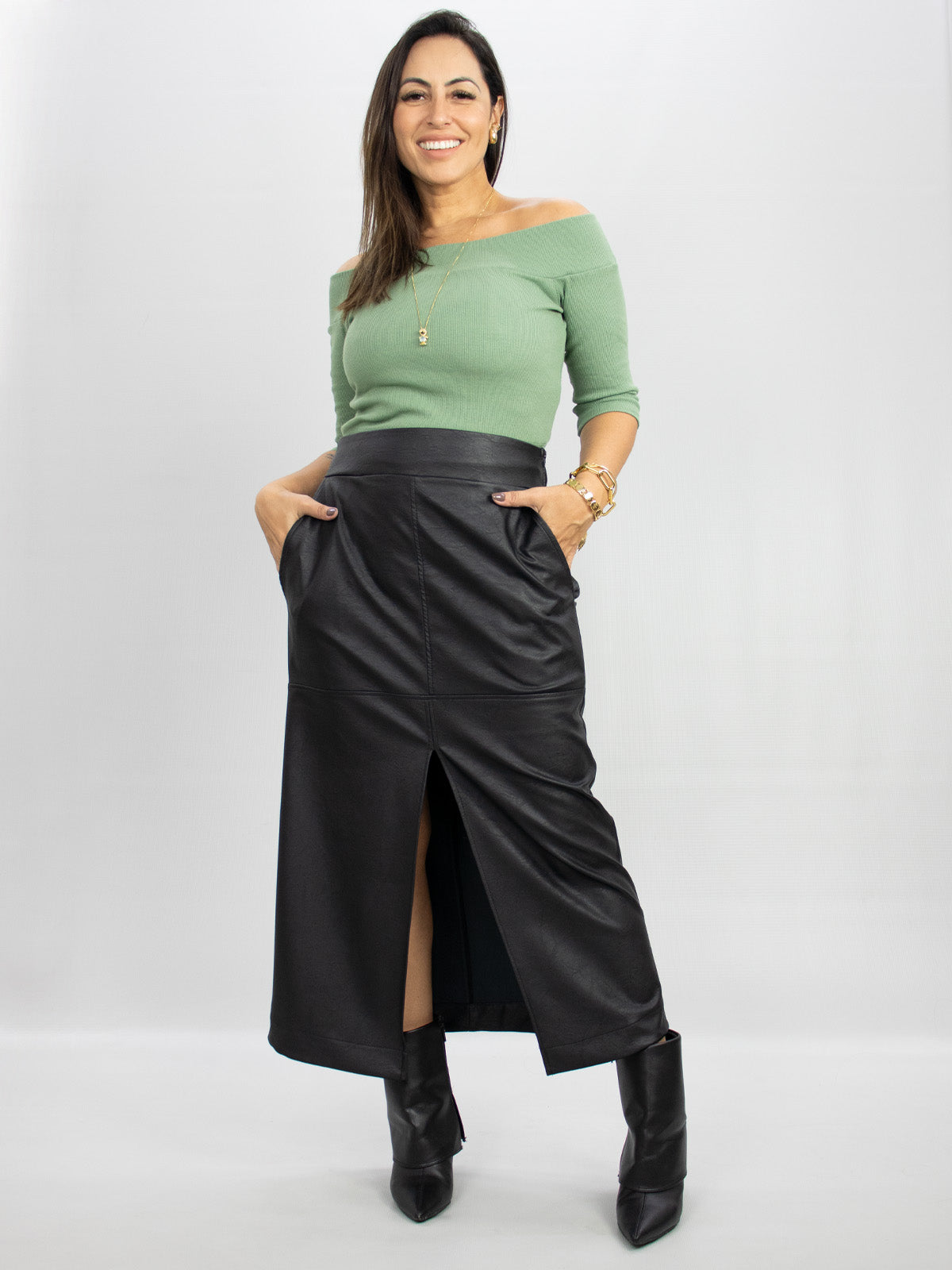 A Saia Deise é uma peça extremamente elegante e moderna, seu comprimento é midi, é mais ajustada ao corpo, com um cós médio, elástico na parte de trás, bolsos nas laterais e posteriores, ela possui o detalhe de uma fenda frontal deixando a peça feminina.