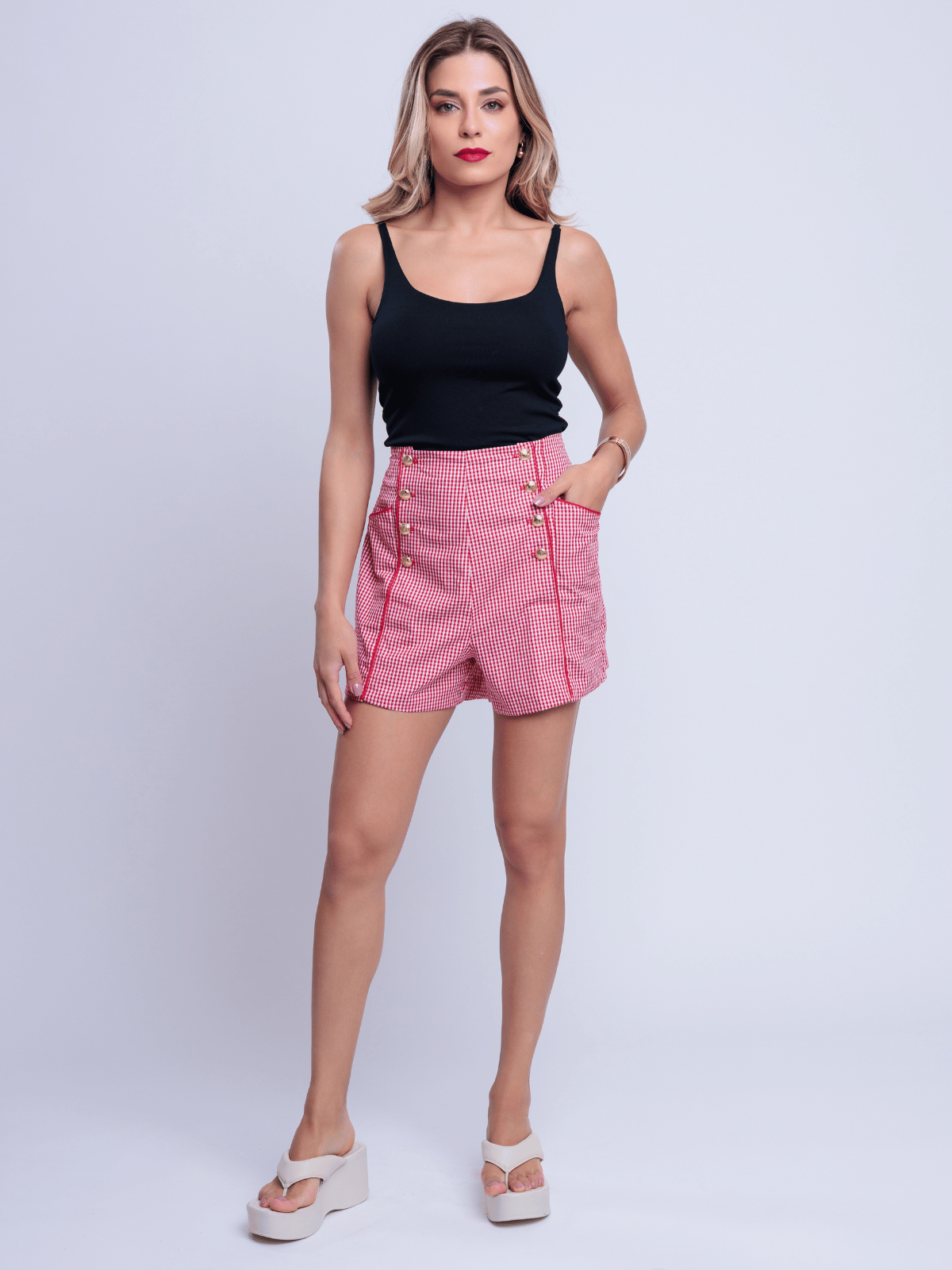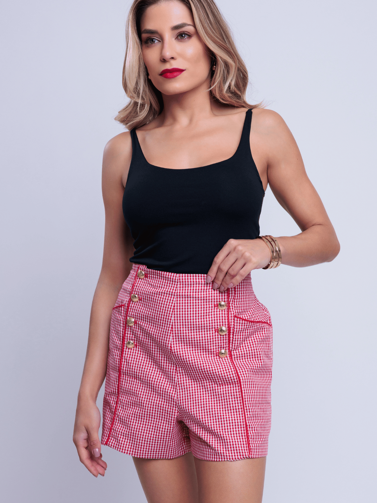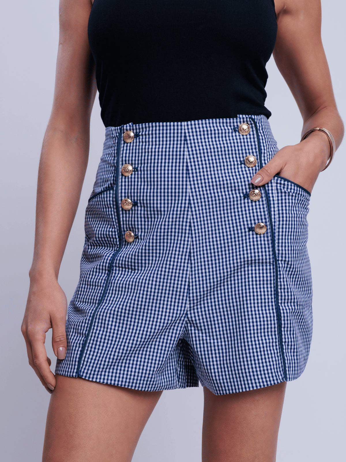 O Short Lucea combina a sofisticação do tecido natural com uma estrutura impecável e respirável. Sua micro padronagem Vichy ganha destaque com o acabamento em vivos no tom da peça e a exclusividade dos botões de brasão, que elevam o design com elegância.