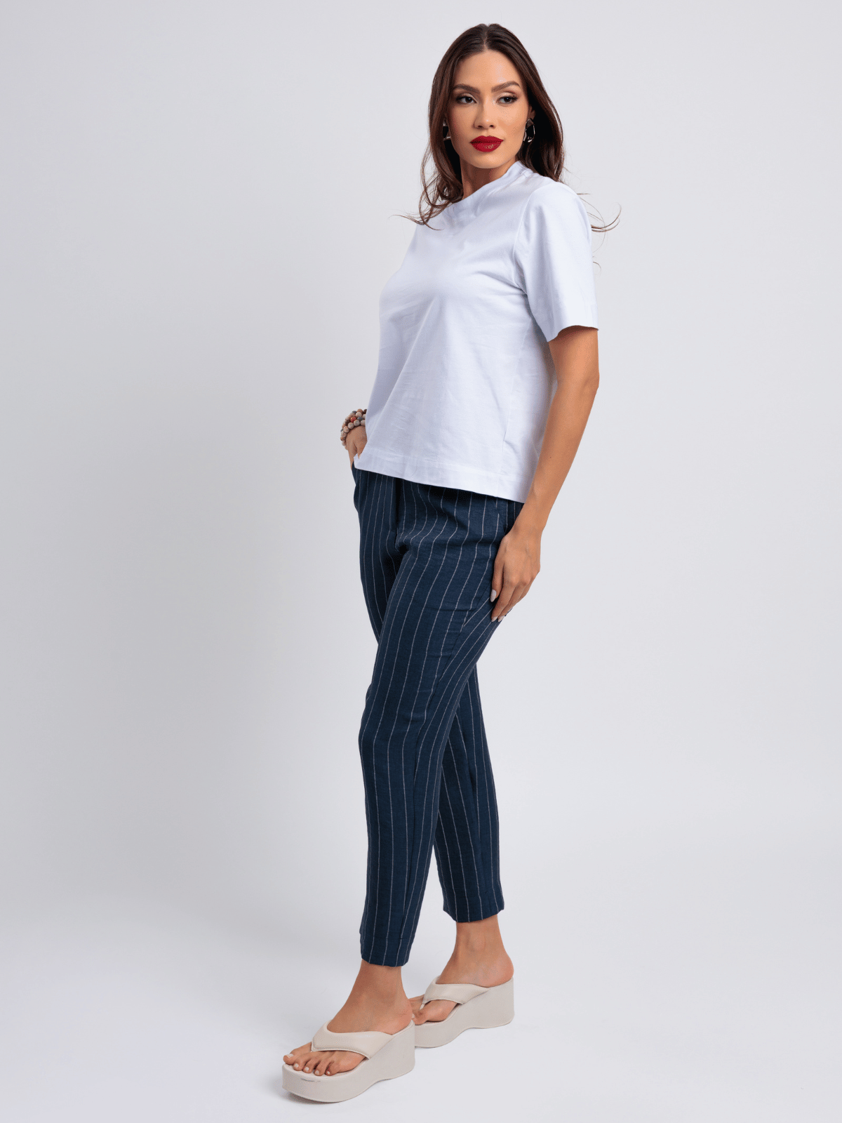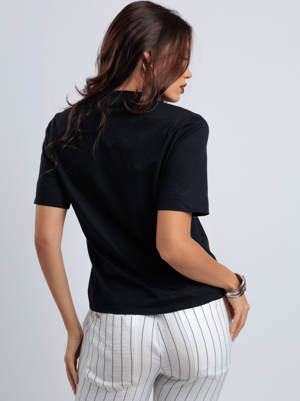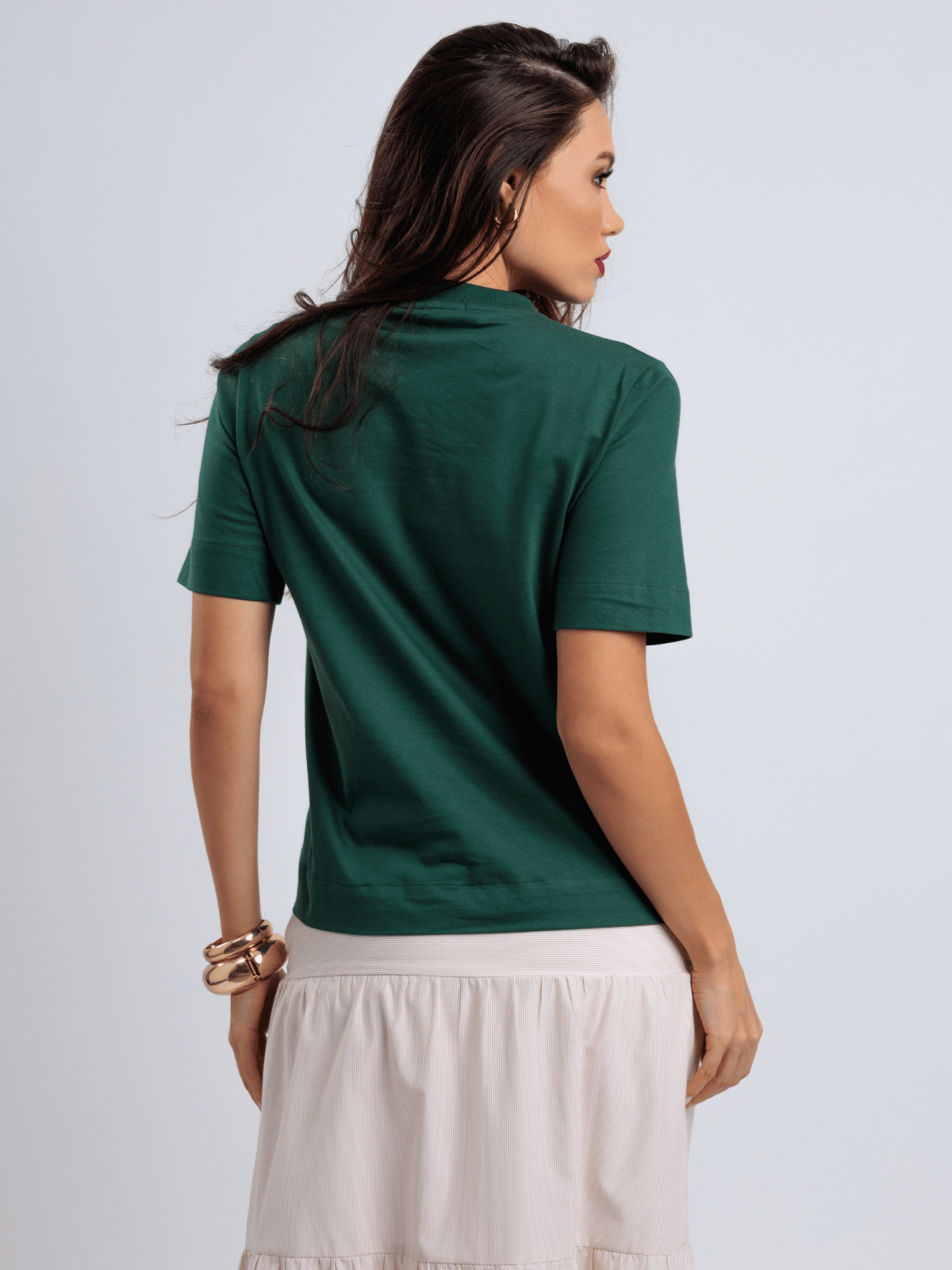 A T-shirt feminina Giovanella combina estilo e sofisticação com estampas exclusivas. Com modelagem clássica, comprimento médio curto, manga curta e gola redonda, é uma peça versátil que transita entre diferentes ocasiões e combina com uma ampla variedade de acessórios e sobreposições.
