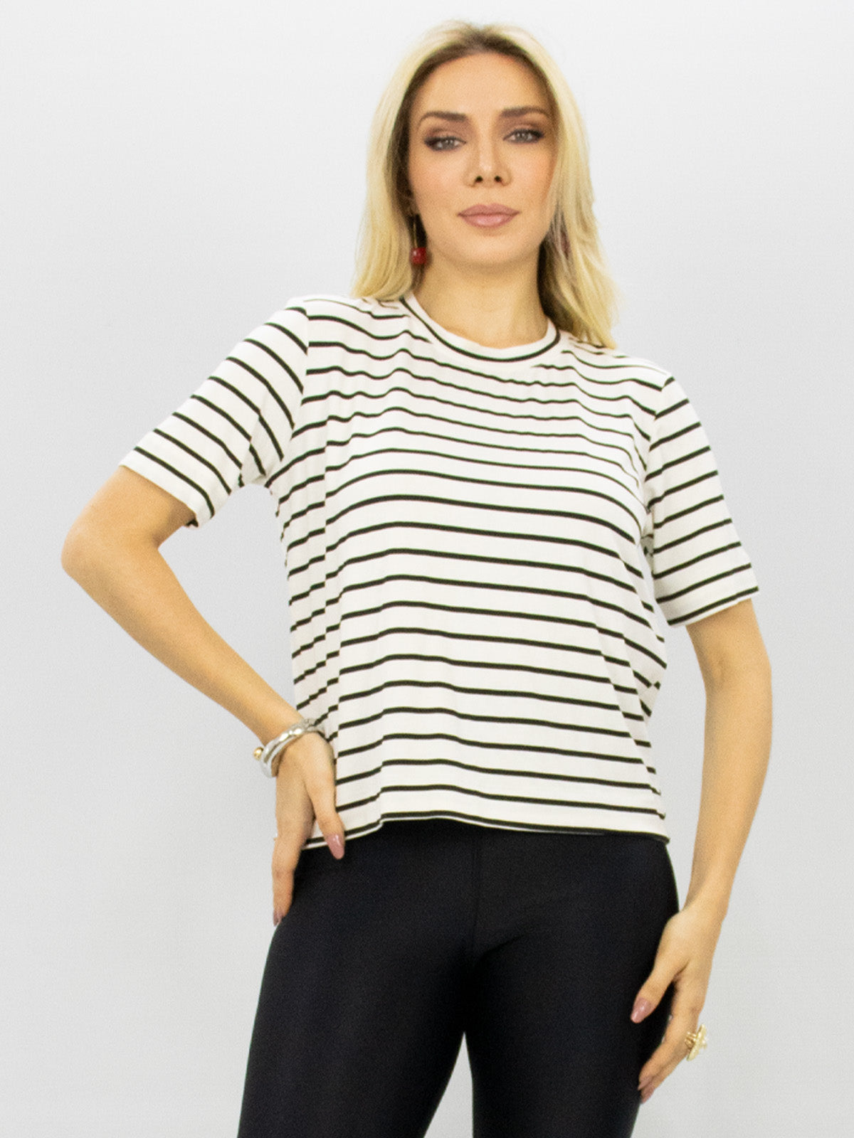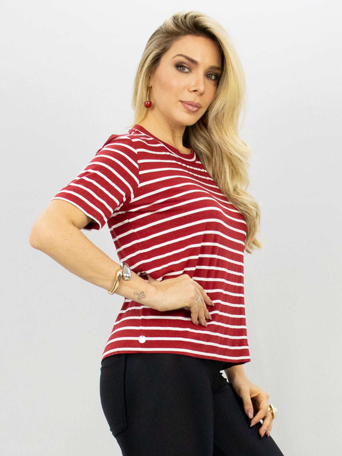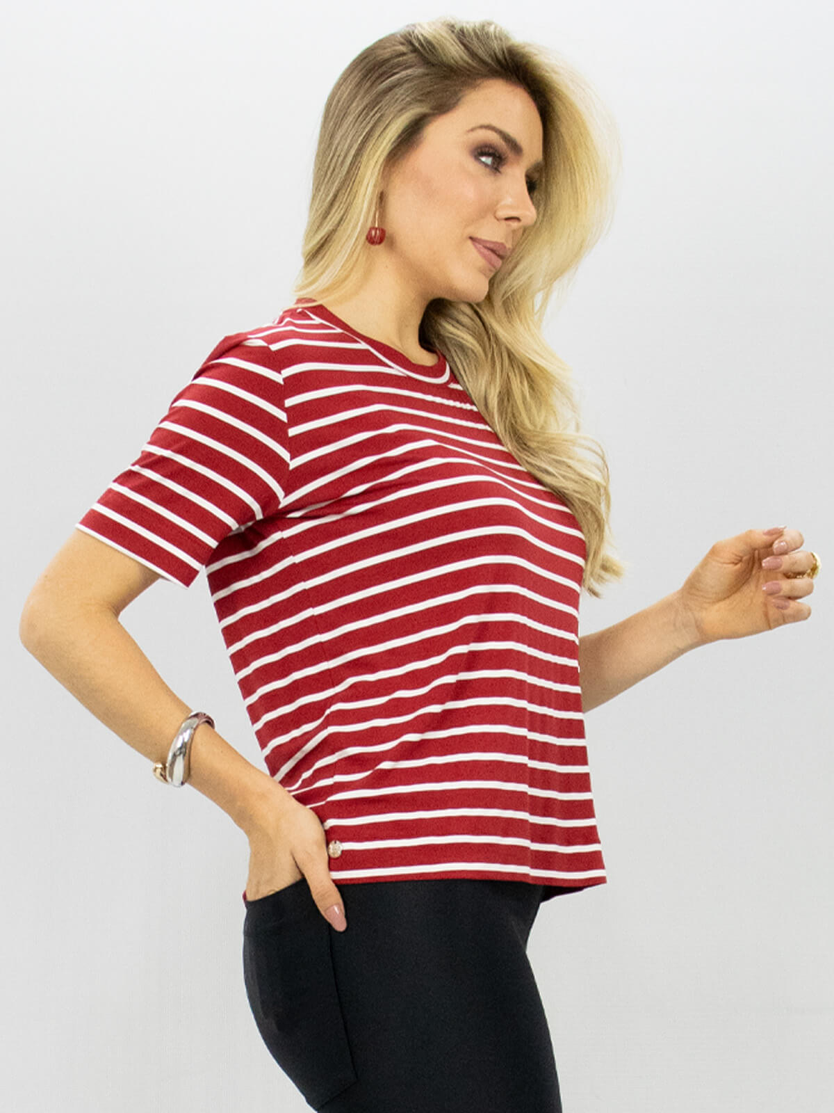 Nossa T-Shirt Lissa vem com listras na horizontal, possui um toque macio e leve e fresco, com uma modelagem moderna, gola careca, manga e comprimento curto, mais solta ao corpo, ela combina estilo e conforto de forma descomplicada. Perfeita para um look mais fashion.