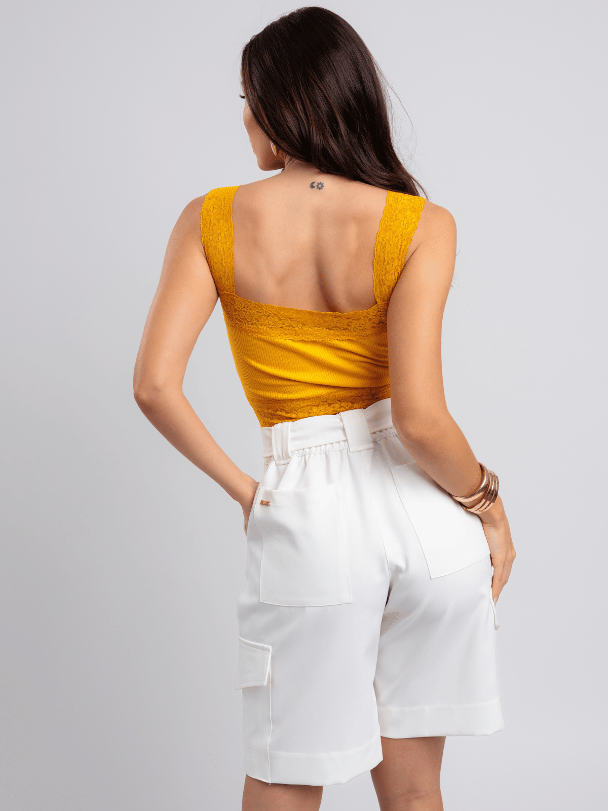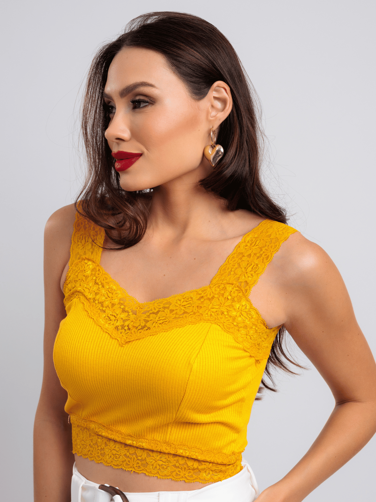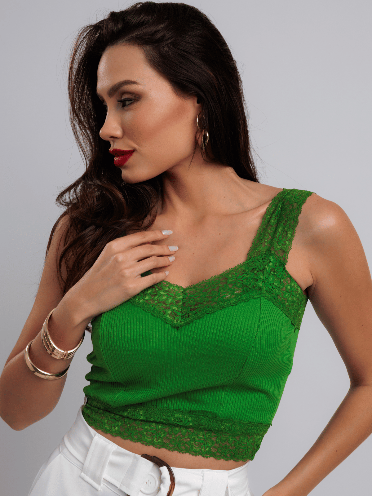 Com modelagem levemente ajustada ao corpo, o modelo destaca-se pelas alças em renda, que acrescentam feminilidade ao visual, e pelo decote arredondado, equilibrando charme e sutileza.