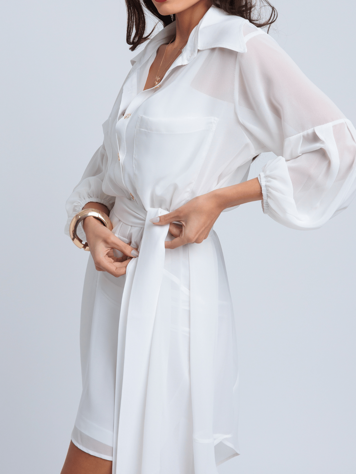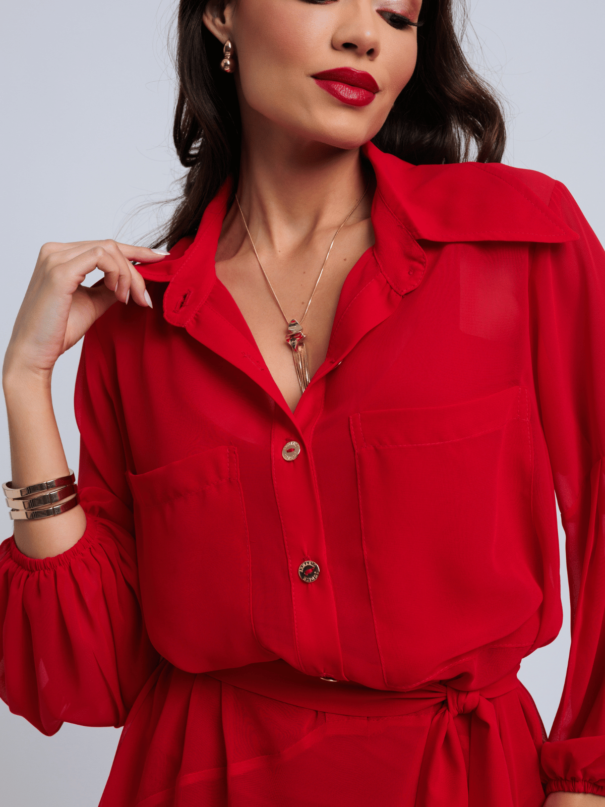 Acompanha uma faixa para amarração, permitindo alternar entre um visual mais solto e despojado ou mais acinturado e refinado.