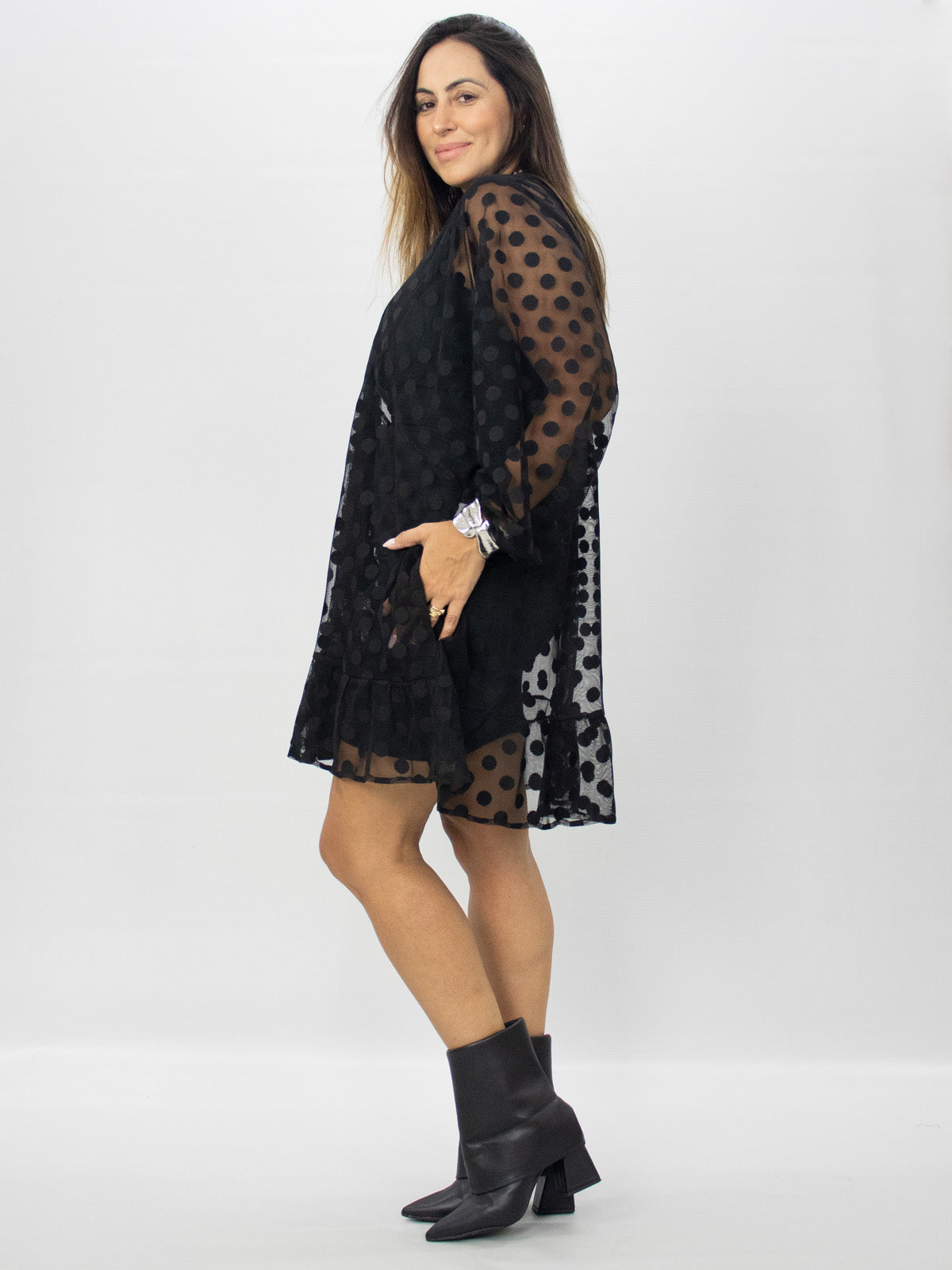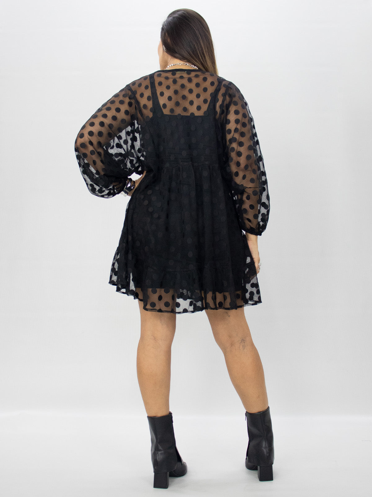 O Vestido de Tule de Poá Cordêlia é o significado de delicadeza. Seu comprimento é curto, sua modelagem é fluida criando assim um movimento suave, possui mangas longas, com decote em V trazendo uma sensualidade sutil, complementado pela amarração frontal com cordão e tassel, que adiciona um detalhe único, sua barra conta com um babado dando o toque final de romantismo.