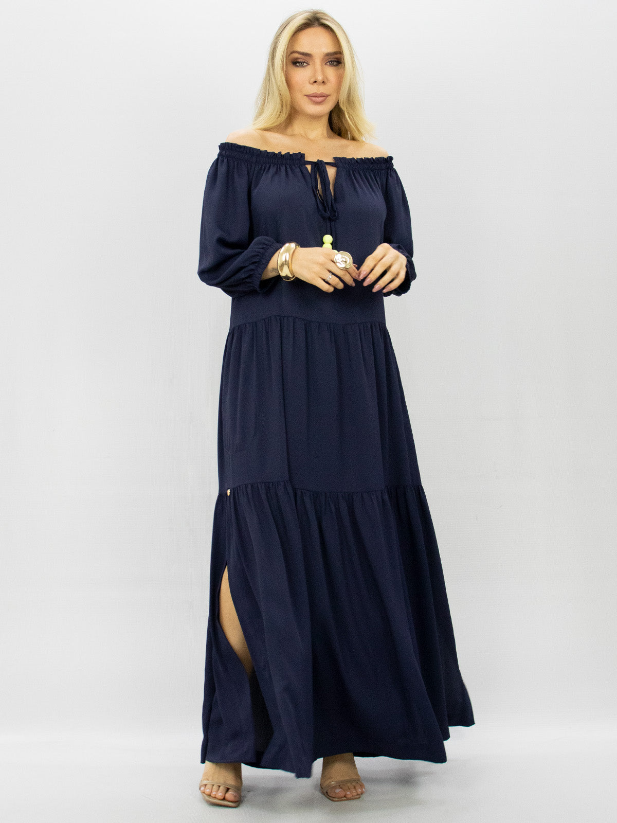 O Vestido La Nuit exala elegância por onde passa. Ele tem uma modelagem longa e fluida, possui mangas mais soltas no braço com caimento leve, é uma peça que tem um ajuste no decote com uma amarração delicada adornada por cordões e ponteiras, seu design permite deixar os ombros à mostra ou cobertos, adaptando-se ao seu estilo. Ideal para quem busca um visual refinado.